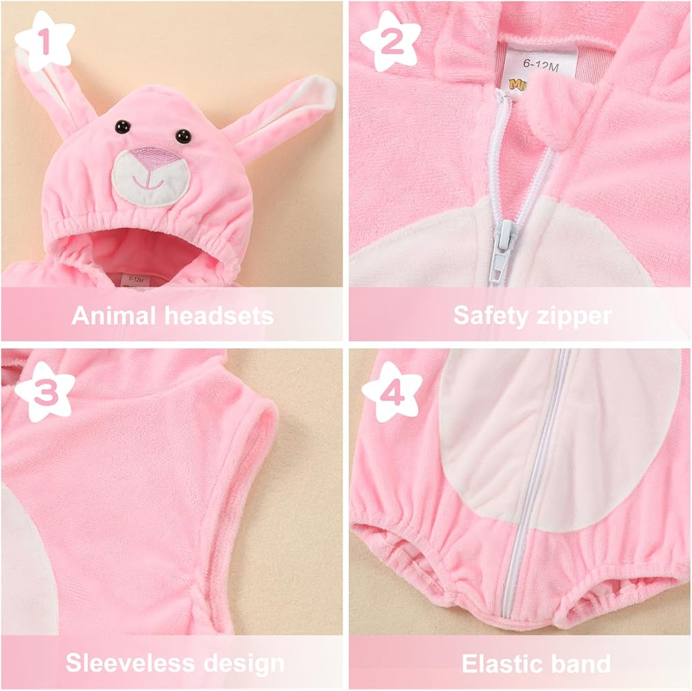 🧸 【EASY ROMPER FOR BABY】 This loveable baby animal romper features a elastic animal hood, sleeveless design, zipper closure to change diaper easily, easy to put on and take off. There are 7 animal styles with bright colors for your baby, bright color always easy to find.