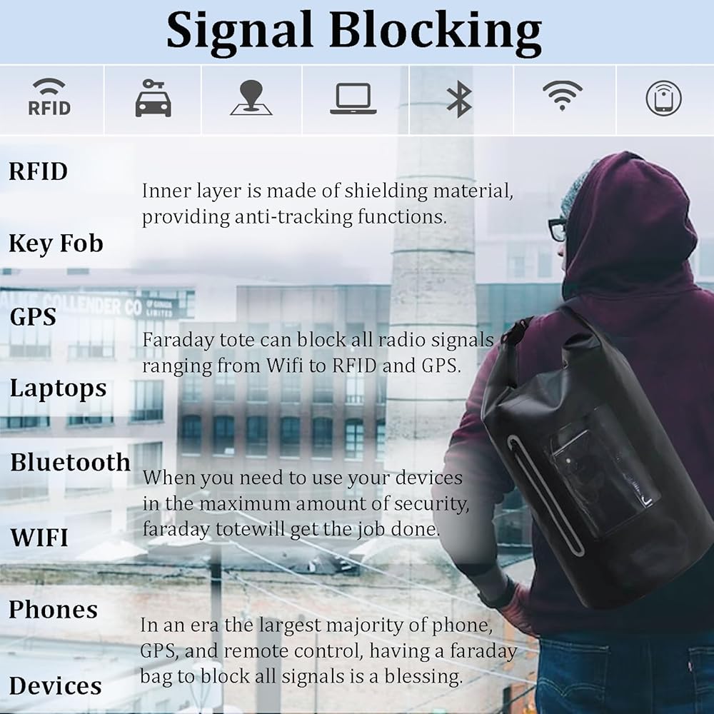 ✔️【15L Capacity & Transparent Pocket】Package includes: faraday bag (16.5'' x 9''). The waterproof bag can hold your laptops, tablets, devices, and a few outfits. And the surface of faraday bags has a transparent zipper pocket where you can store your keys, wallet, and credit cards.