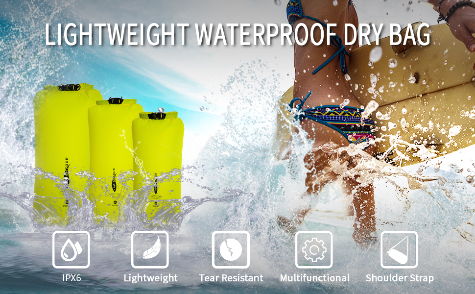 【Waterproof Material】 The waterproof dry bag is made of 70D high tenacity football texture nylon cloth. All seams are heat-pressed, and the waterproof performance level reaches ipx6. The dry bag has a smooth surface and is easy to wipe/rinse clean.