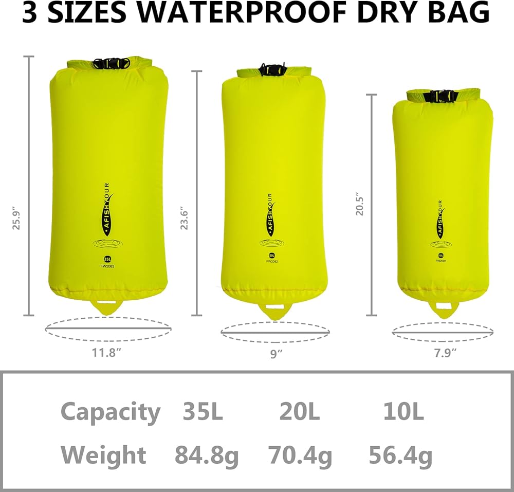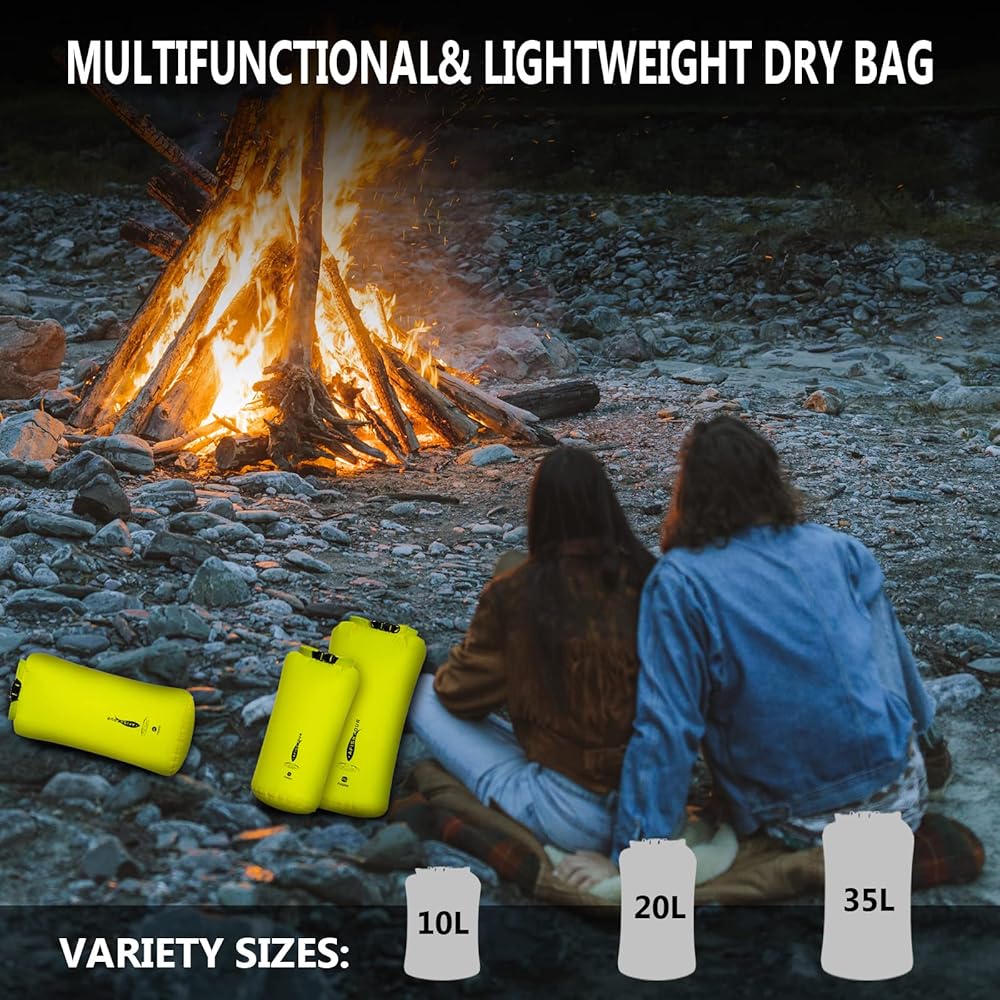 【Ultra Light & Durable】The small dry bag is made of a special nylon material that effectively balances light weight (10L-56g, 20L-70g, 35L - 84g) and durability, keeping your items dry and clean with hardly any added weight.