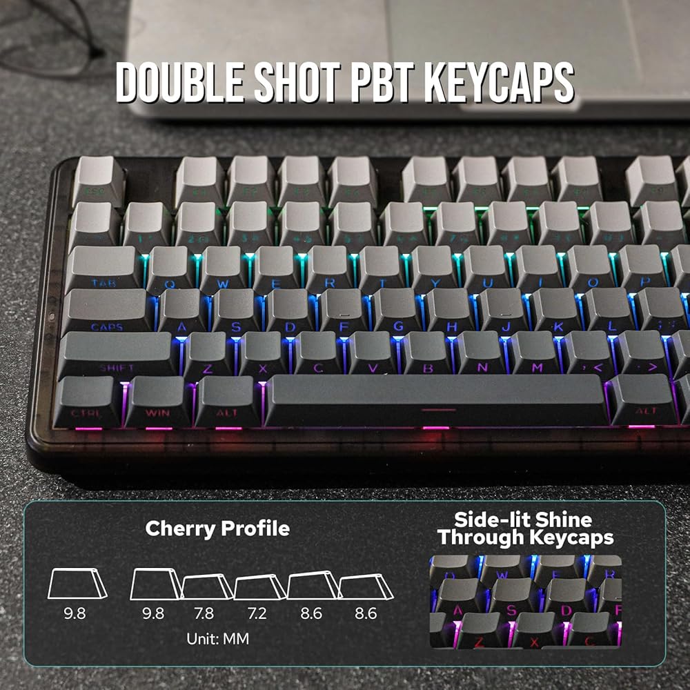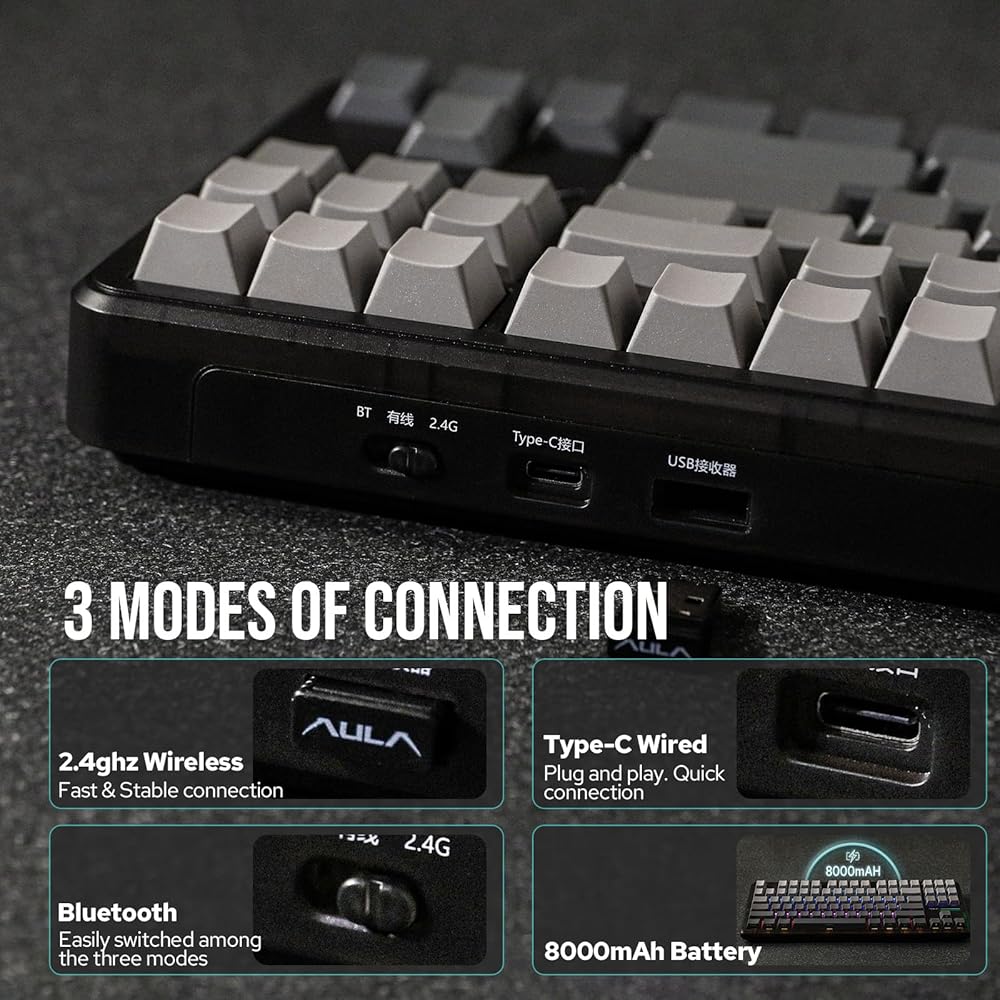 【3 Modes of Connection,8000mAh Battery】The F87 Pro supports connection via Bluetooth or 2.4GHz for wireless connectivity, or with the included Type-C USB cable. By three means of connection, The F87 Pro is easily switched among the three modes for efficient multitasking and speedy performance. Included 8000mAh battery ensures a long and steady use, without worries of short out.