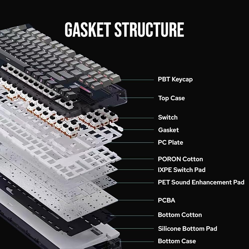 【Five-Layered Sound-Absorbing Padding】The F87 Pro is designed with a five-layered padding structure, including IXPE under-shaft padding and PORON Cotton, to provide soft acoustics. This design greatly enhances the keyboard's sound quality for a cleaner and quieter typing experience.