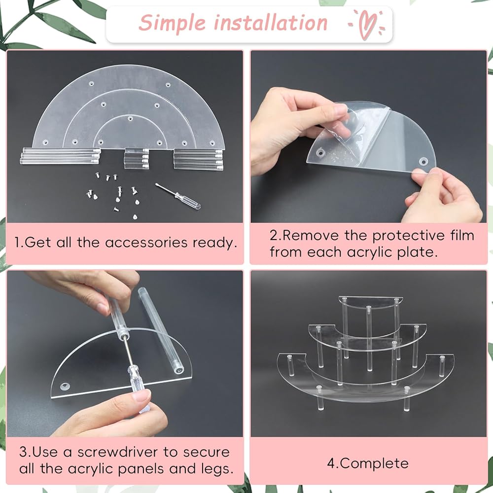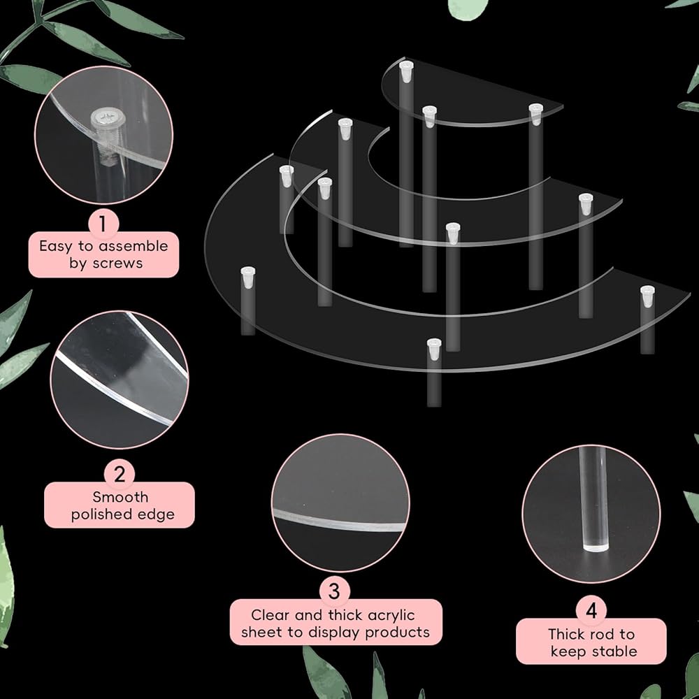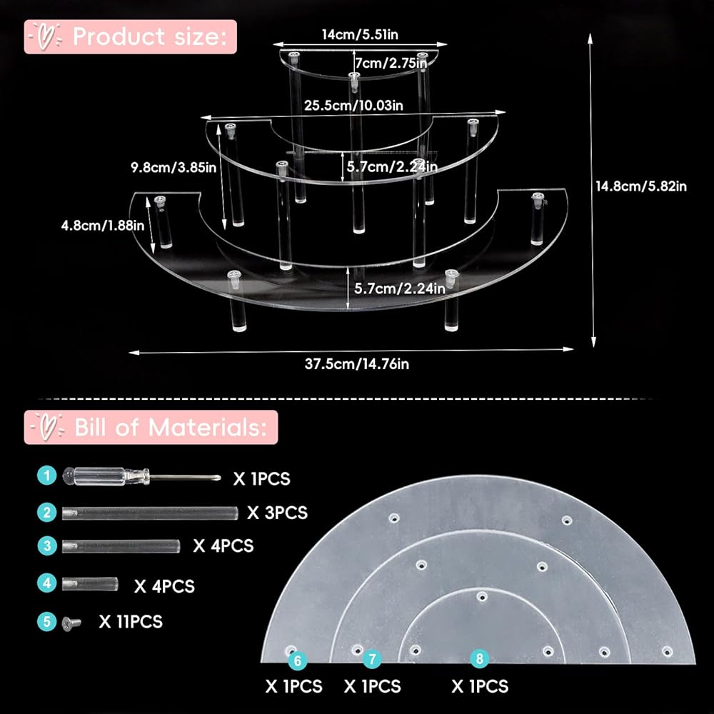 🍯【Multifunctional Usage】: Our versatile 3-tier acrylic half-moon display stand serves a multitude of purposes. It is perfect for displaying cupcakes, desserts, garage kits, perfume bottles, lipsticks, desktop collectibles, crystals, and more. Also great for parties, shop windows and bathrooms,The elegant design guarantees an enhanced and enjoyable experience at parties or in your daily life.