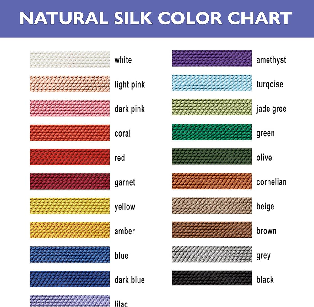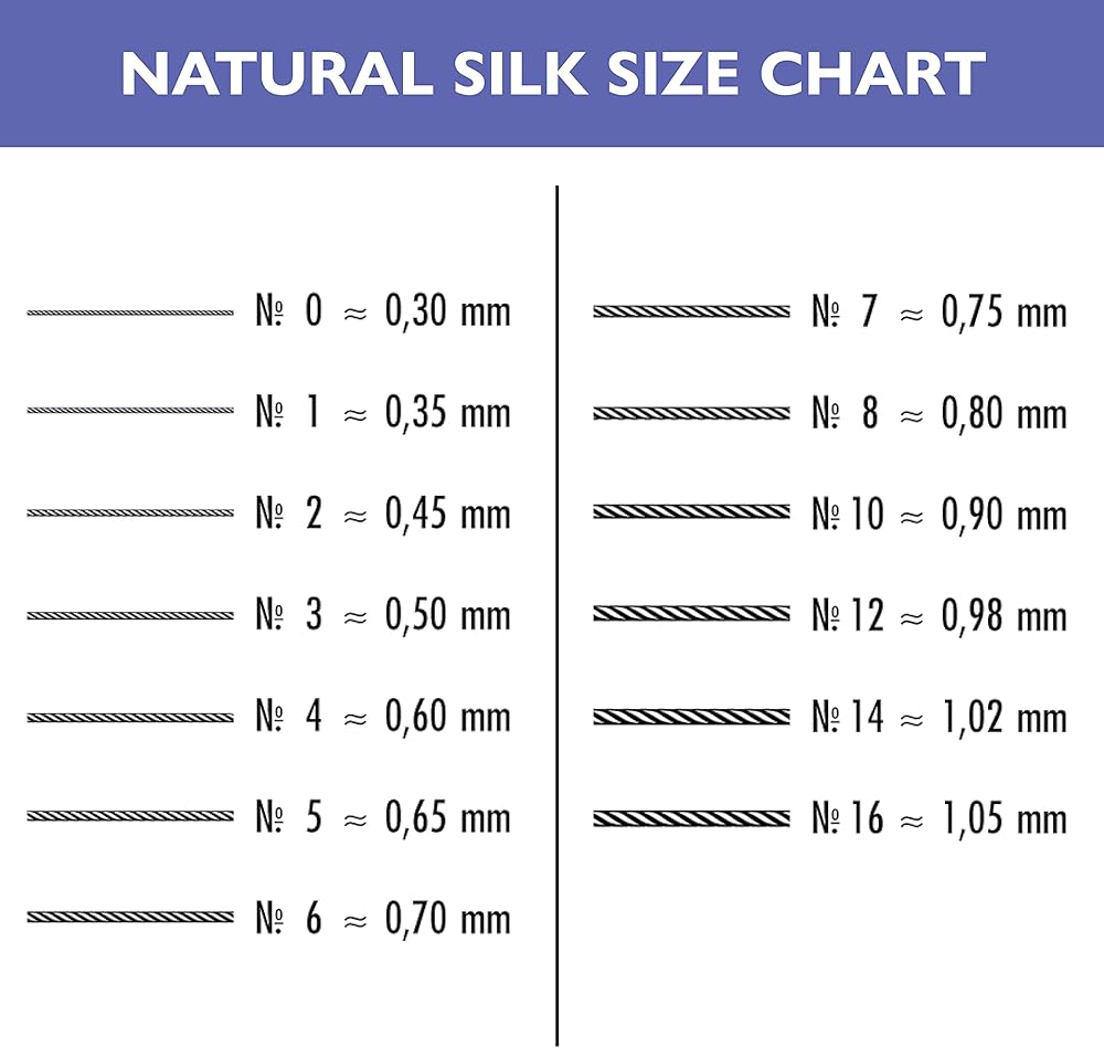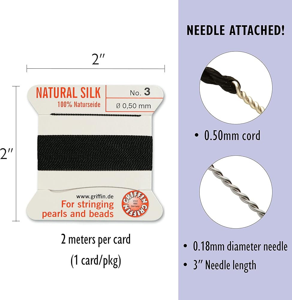 GRIFFIN 100% Natural Silk Bead Cord is available in 20 natural colours and 13 different thread sizes. Each colour is available in 13 different thread sizes #0 to #16. Each Card contains two metres (approx. 79 inch) of 100% natural thread with a stainless steel needle attached. High Quality products Made in Germany