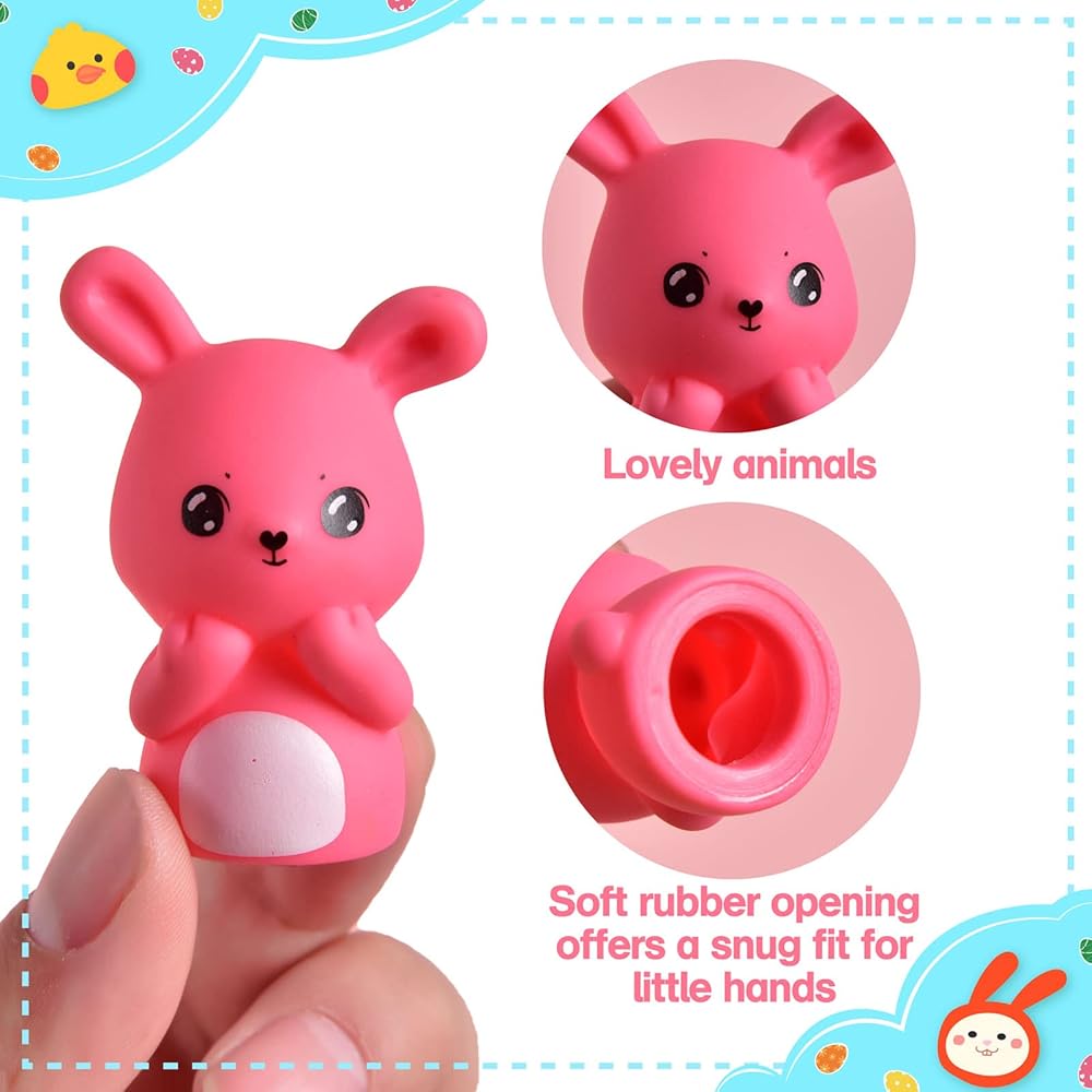 Super Value Packs: Easter Bath Toys include 5 Bunnies & 5 Chicks, featuring vibrant colors, different postures, and facial expressions. Bath Finger Puppet fits both kids' & adults' fingers 2.16" Tall x 1.5" Wide. From now on, your kids will love Bath Time!