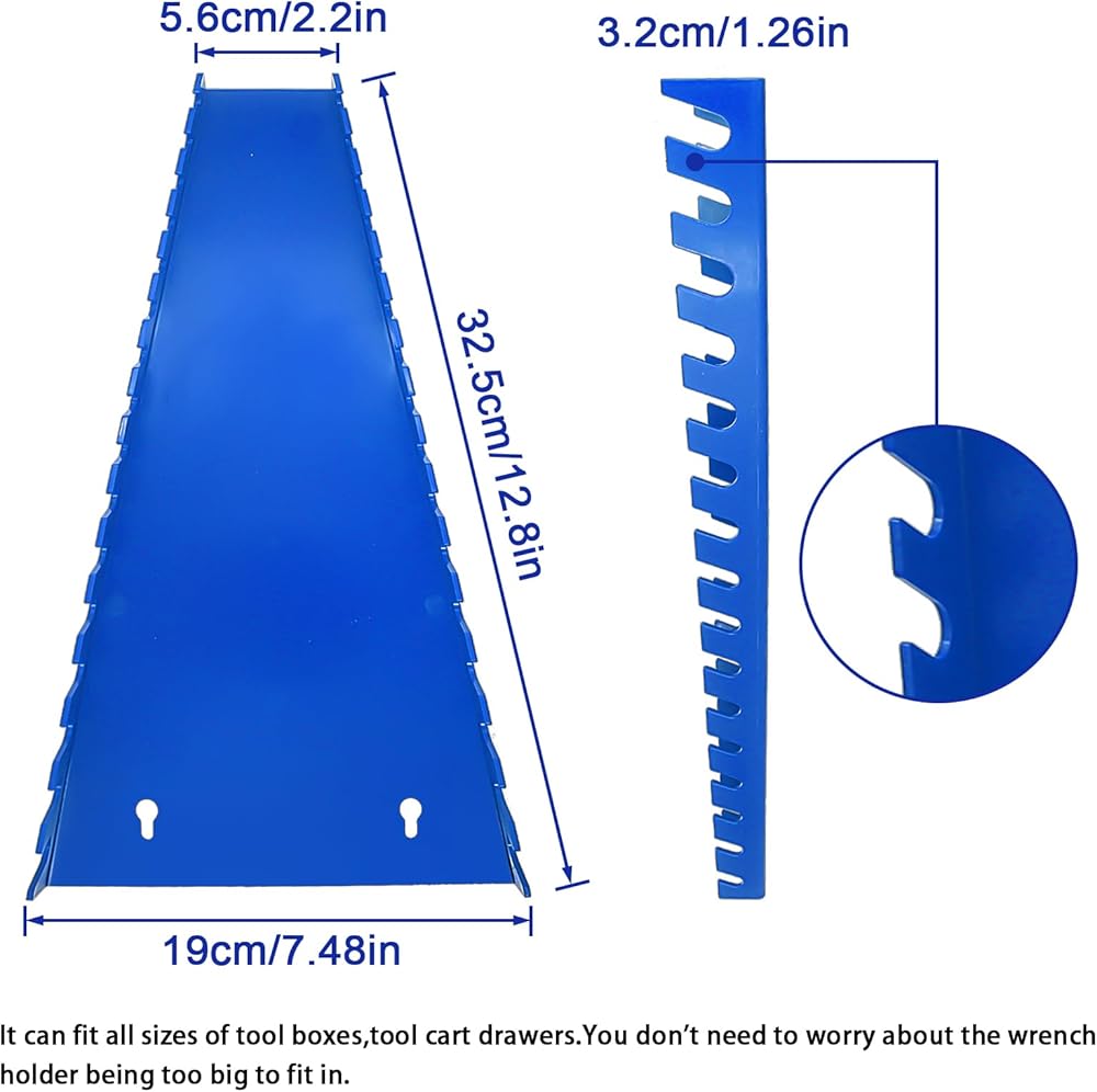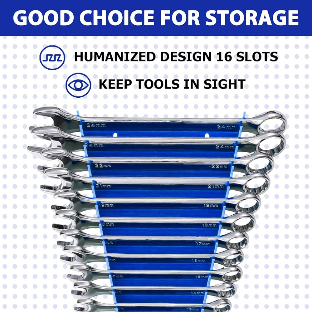 ➤Multiple Application: The wrench holder accommodates SAE sizes of 1/4" to 1", and Metric sizes of 8mm to 22mm. SAE: 1/4, 9/32, 5/16, 11/32, 3/8, 7/16, 1/2, 9/16, 5/8, 11/16, 3/4, 13/16, 7/8, 15/16, 1-inch. Metric: 8mm, 9mm, 10mm, 11mm, 12mm, 13mm, 14mm, 15mm, 16mm, 17mm, 18mm, 19mm, 20mm, 21mm, 22mm.