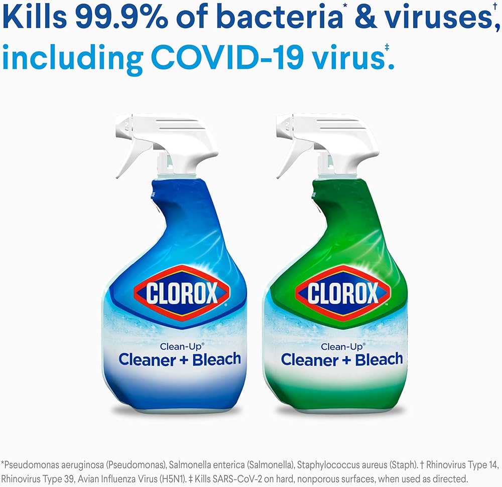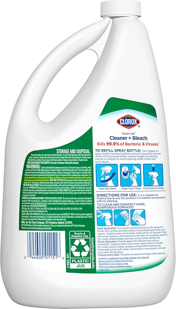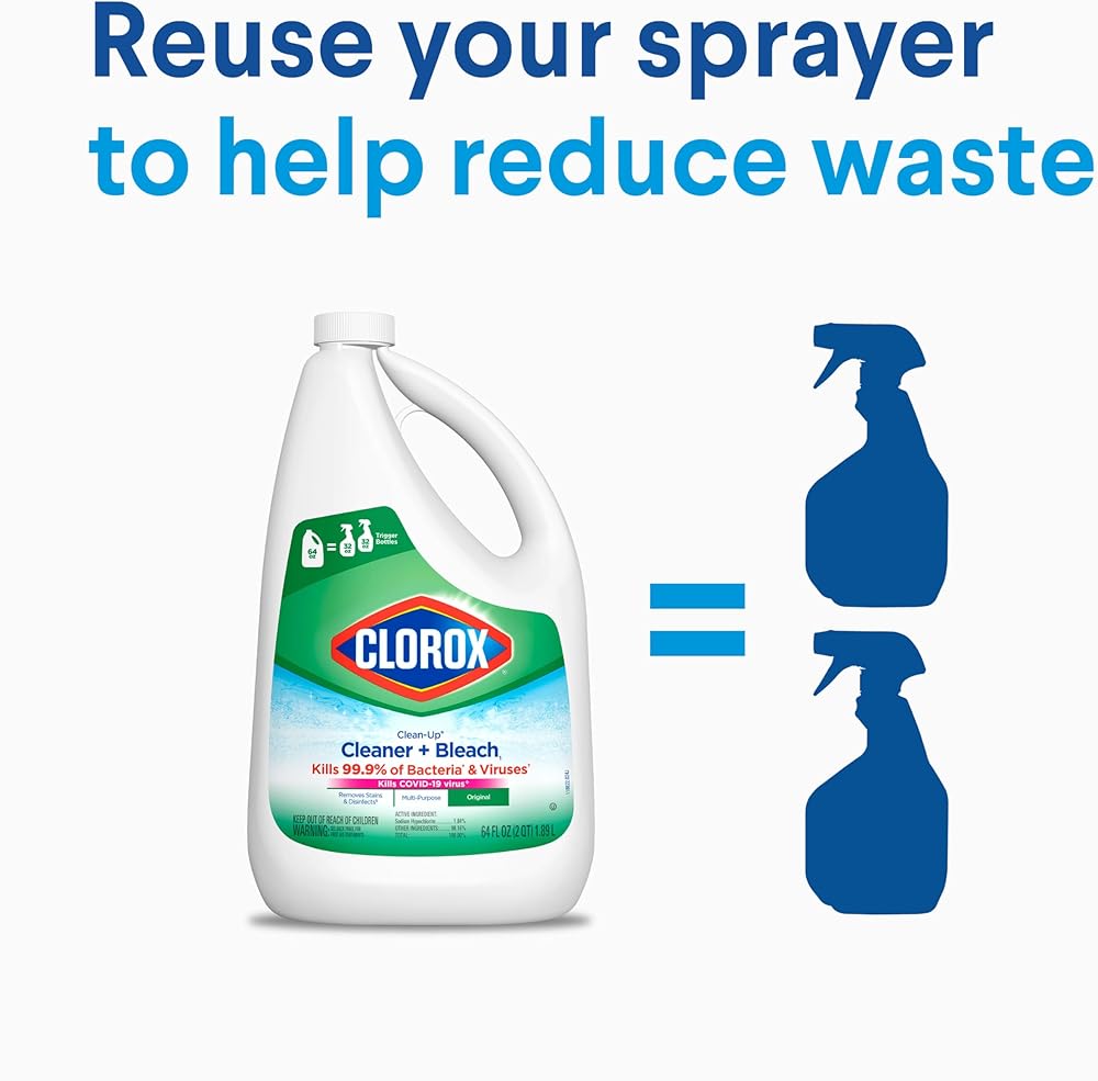 Clorox clean-up all purpose bleach Spray Cleaner is designed to quickly and effectively clean, disinfect and deodorize a variety of surfaces both indoors and outdoors. It removes tough kitchen and bath stains, grease and dirt on contact, while killing over 99% of germs. This household cleaner is can be used on multiple hard, nonporous surfaces throughout your home, including kitchen sinks, counters, refrigerators, appliances, tubs, toilets, fiberglass, floors, Showers and tiles. This 64 ounce refill bottle will refill two 32 ounce spray bottles, which will save you time and money. This cleaner leaves your home sparkling clean and smelling fresh. Clorox Clean up cleaner with Bleach gets the job done.