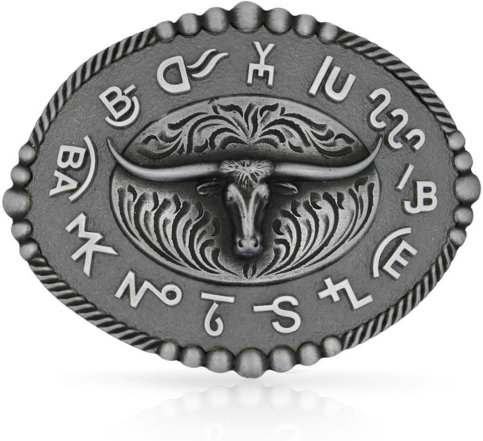Montana Silversmiths Western Belt Buckle: This rounded rectangular Longhorn Legend Heritage Attitude buckle is perfect for the everyday. The brushed surface is the perfect backdrop for a longhorn figure and is surrounded by classic Montana Silversmiths filigree. A diamond Aztec design sits atop the buckle adding additional interest and a rope borders the entire piece. Standard 1.5 inch belt swivel. Gold over a white metal alloy. You can maintain your silver brilliance with an occasional wipe of a damp cloth. DO NOT use chemical or abrasive cleaners. A973C