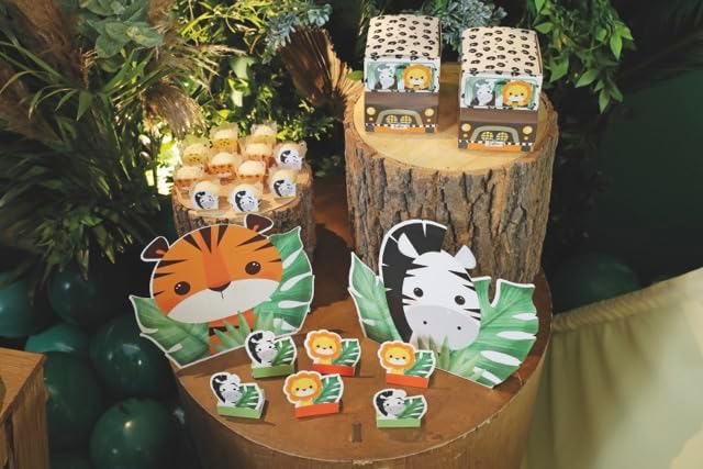 Enhance the safari ambiance of your event with our captivating Safari-Themed Centerpieces. This set includes 4 beautifully designed centerpieces featuring iconic safari animals - Zebra, Lion, Giraffe, and Tiger. These centerpieces will add a touch of wild elegance to your table decor. The Zebra centerpiece measures 10.16 inches in width and 8.23 inches in height, showcasing the striking black and white stripes that make zebras so distinctive. The Lion centerpiece boasts dimensions of 10.16 inches in width and 8.23 inches in height, capturing the majestic beauty of the king of the jungle. The Giraffe centerpiece stands at 9.33 inches in width and 8.43 inches in height, displaying the long neck and graceful spots that characterize this magnificent creature. Lastly, the Tiger centerpiece measures 9.33 inches in width and 7.87 inches in height, depicting the fierce beauty of this striped predator. Crafted with attention to detail, these centerpieces serve as eye-catching focal points for your tables. They are made from high-quality materials, ensuring durability and longevity, so you can enjoy their splendor throughout your event and beyond. These safari-themed centerpieces are perfect for birthdays, baby showers, themed parties, or any occasion where you want to create an immersive and adventurous atmosphere. Place them on your tables, mantles, or gift tables to impress your guests and transport them to the enchanting world of the savanna. Bring the wild allure of the safari to your event with our Safari-Themed Centerpieces. Order your set today and let the animals roam on your tables, adding a touch of elegance and excitement to your celebration.