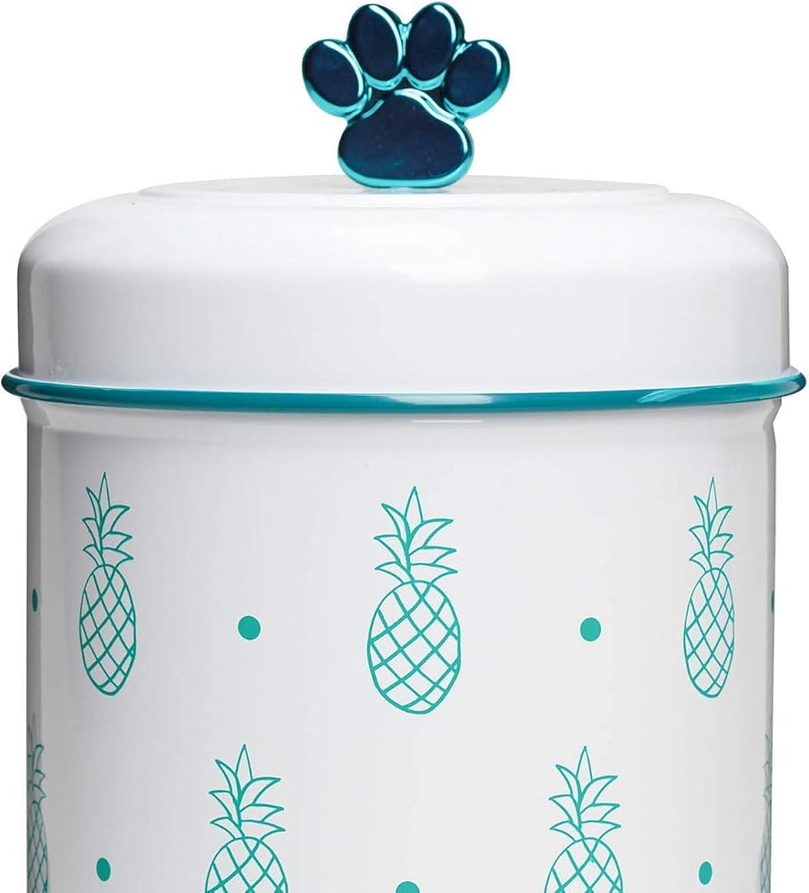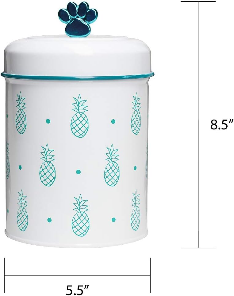 Pet treat storage meets chic home décor in the Amici Pet Pineapple Medium Metal Canister. This fun metal storage canister features a white powder coat base on a cylindrical shape with a whimsical pattern of evenly-spaced metallic turquoise pineapples and polka dots. The gasketed lid is lined with a shiny metallic turquoise edge with a matching paw shaped knob at the top. This is the smaller of the two canisters in this collection with a capacity of 64 fluid ounces. Food safe, this metal food storage canister will add a touch of personality to your countertop. It is recommended that this metal canister be hand washed with care.