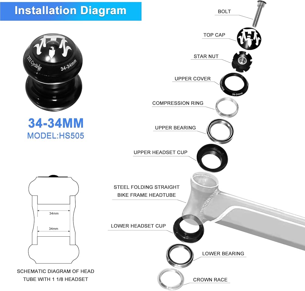 【Applications】Designed for 44-56mm frame head tubes and 28.6mm straight tapered steerer fork head tubes,Crown Race: 30/39.8mm. Suitable for mountain bike road bicycle, convenient and durable, it guarantees convenience, durability, and easy installation, featuring high-quality, low-friction face-seals on the crown races. The 1-1/8" Threadless headset comes complete with a headset star nut and bolt.