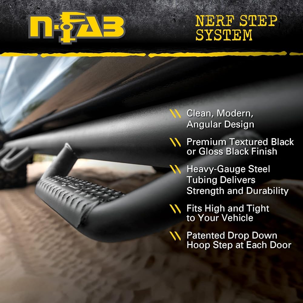 N-Fab Nerf Steps feature a clean design that fits high and tight to the vehicle body in either premium textured black or gloss black finishes, adding to the modern look of your ride. Nerf Step's fully welded 1-piece construction offers strength and durability. With a patented drop down hoop step at each door with metal, dimpled step plates, Nerf Steps allow for easy access to your stock or lifted vehicle and deliver reliable traction and stability in any weather condition. Installation is easy. Includes all mounting hardware and easy to understand, vehicle specific instructions. N-Fab products are backed by an industry leading 5-year warranty on the product's finish, and Limited Lifetime warranty on workmanship.