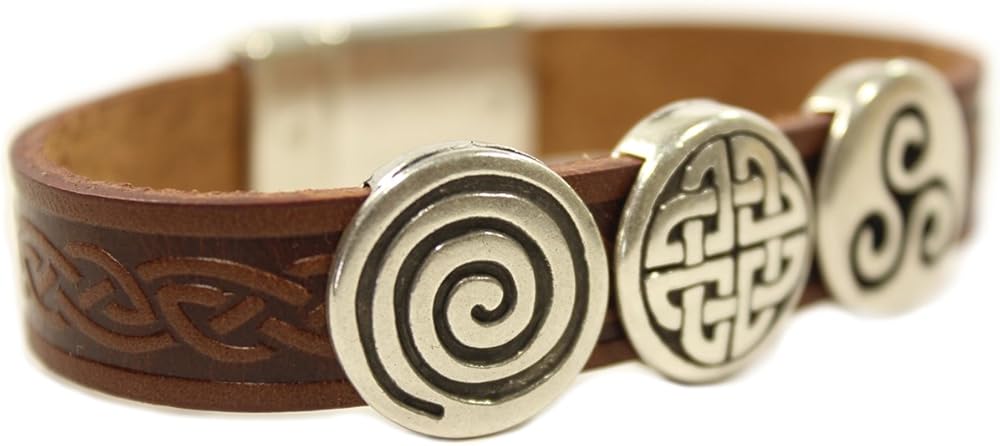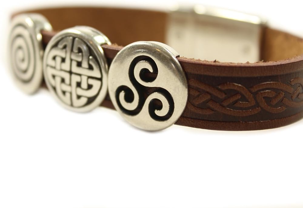 - Celtic leather bracelet comes in choice of black or brown and two sizes, 7” long or 7 ½” long.