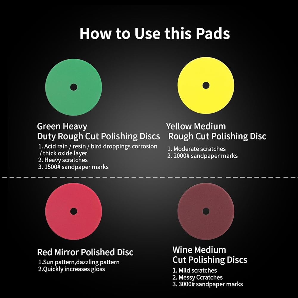 EFFICIENT SET FIT FOR ALL PURPOSE - Sponge pads of different colors have different hardness, from coarse to fine, which can achieve the integration of cutting, polishing, finishing and waxing, quickly removing scratches, swirl mark, corrosion, oxide layer and increasing gloss to make the car surface new again.