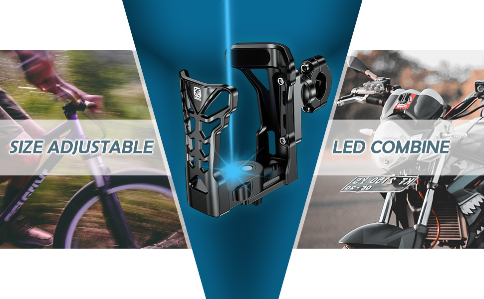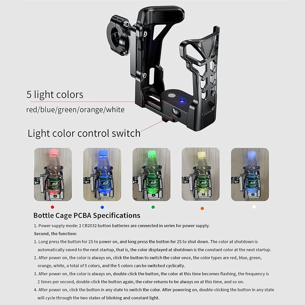 Bike Motorcycle Drink Bottle Holder for Large - φ1.9-φ3.5 Adjustable 360° Universal for Bicycle/Scooter, Multi-Color LED Light for Night Riding, Matte Black