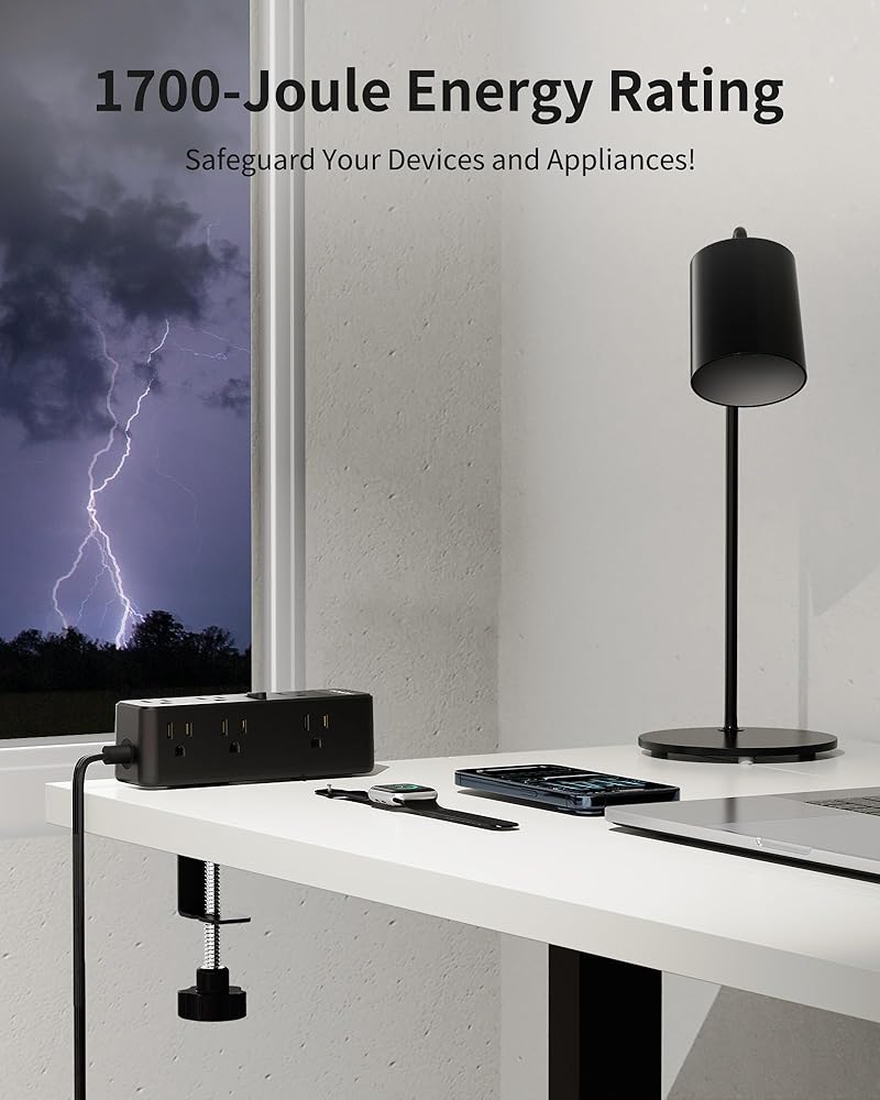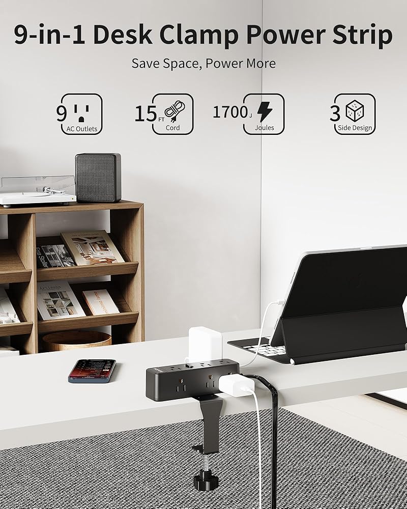 【13-in-1 Desk Clamp Power Strip & Space-Saving Design 】: Equipped with 9 AC outlets and 4 USB (2 USB-C) ports, this desk power strip turns 1 outlet into 13, allowing you to power 13 devices simultaneously to save more time. Also, the surge protector has outlets on three sides, compact design, which takes up less space while making the desktop look uncluttered and allowing for more devices to be charged.