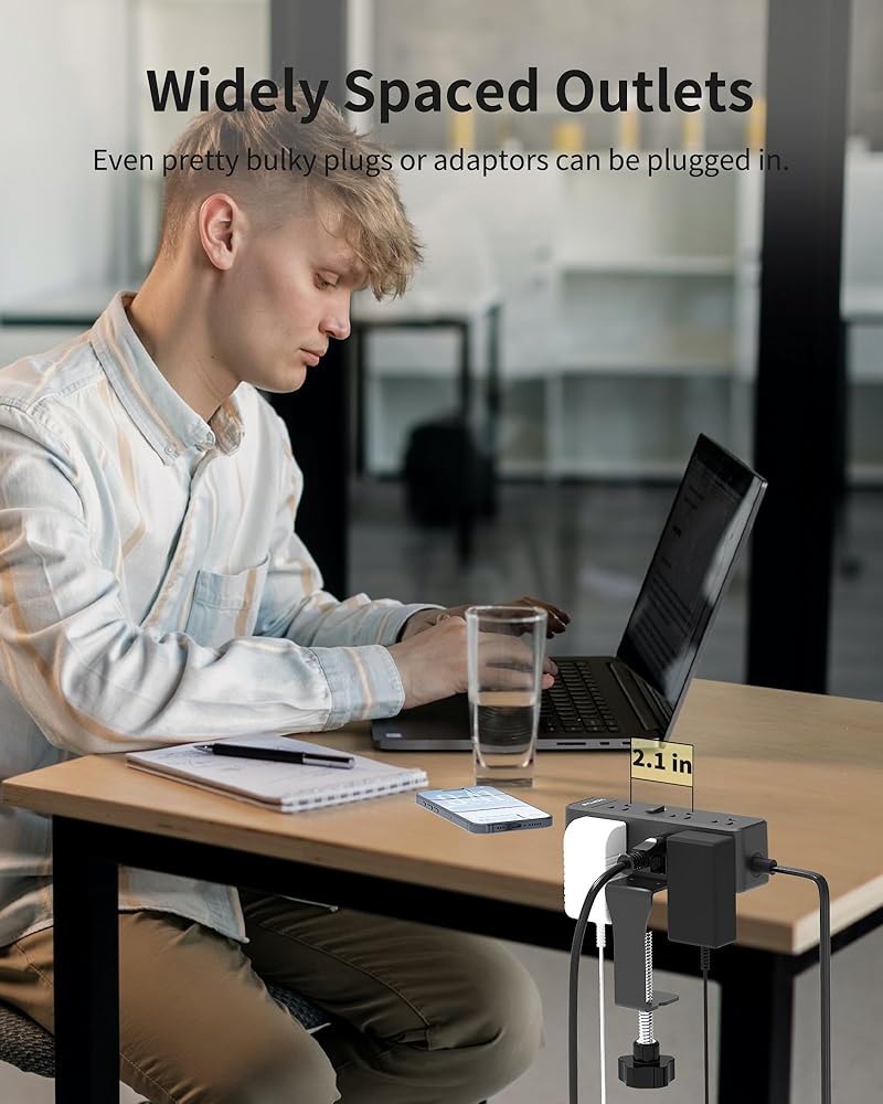 【Desk organizers & Freely adjustable】: This clamp outlet is perfect for your office desk, game table, standing desk, etc., it can be fixed very stably on the back or edge of your desk and help get your desk organized. Plus, the desktop clamp power strip can be freely adjusted according to the thickness of the table, the maximum can clip 7cm/2.75in thickness table.