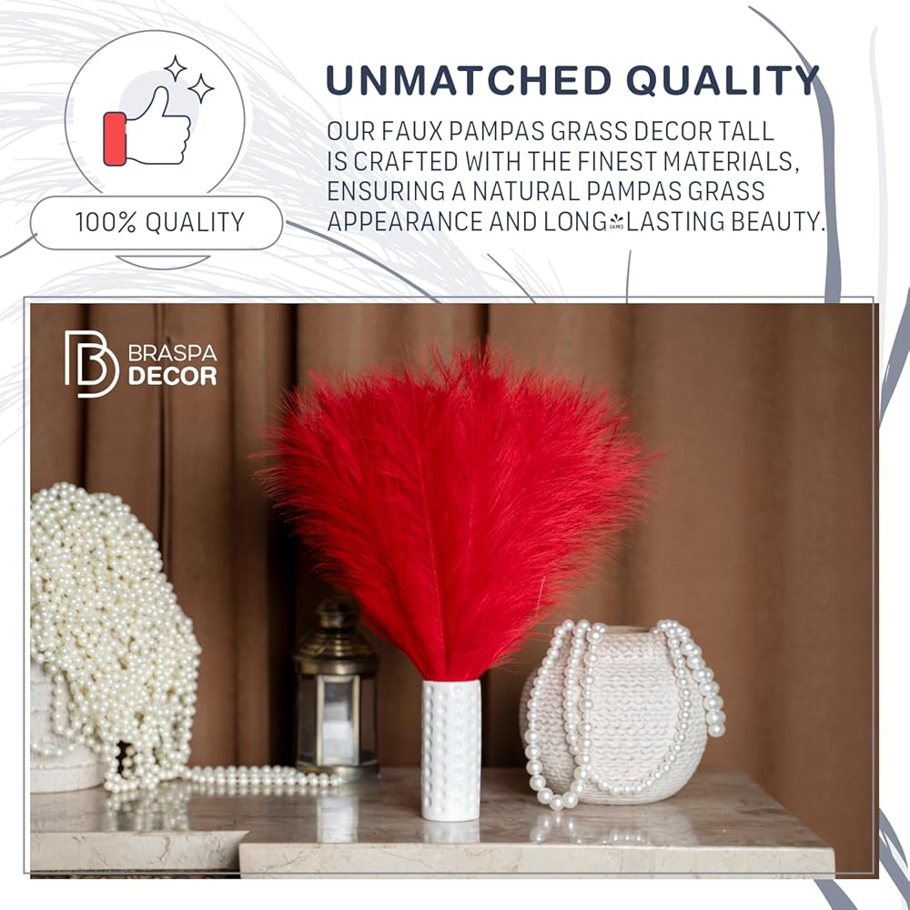 🥇𝗨𝗡𝗠𝗔𝗧𝗖𝗛𝗘𝗗 𝗤𝗨𝗔𝗟𝗜𝗧𝗬: Our 17-inch red pampas grass decor is expertly crafted using premium materials, red feathers ensuring a natural appearance and long-lasting beauty.