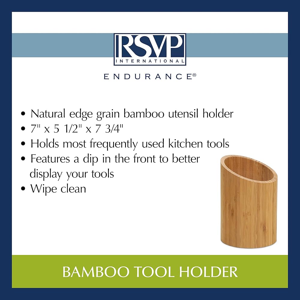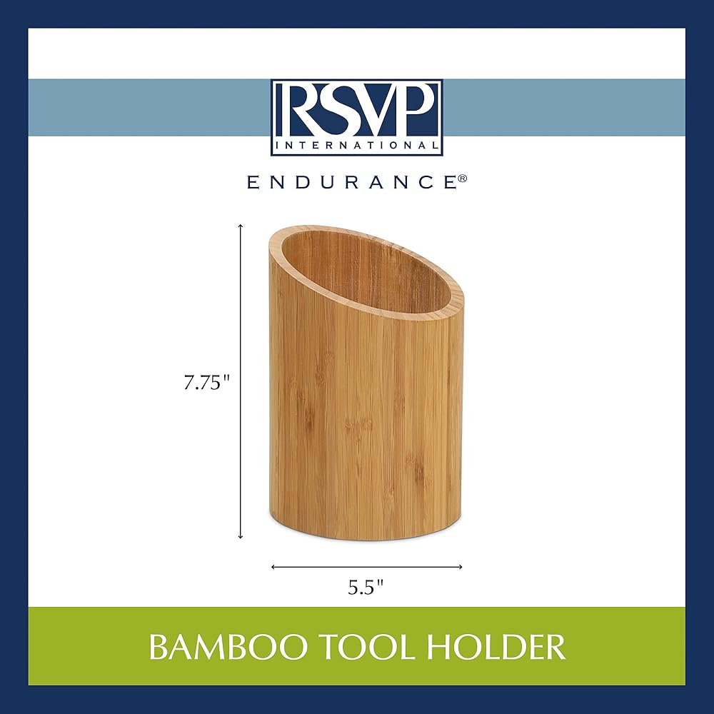 Rsvp strives to offer quality kitchen products and cooking tools at competitive prices. Our bamboo tool holder is a perfect example. Sloped opening and divided insert keeps tools upright in this bamboo tool caddy. Measures 5.5" in diameter by 7.75" tall. When all the right people, and ingredients, kitchen tools, and food come together, we call this the art of gathering.