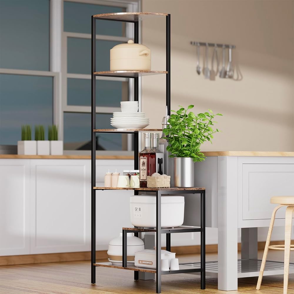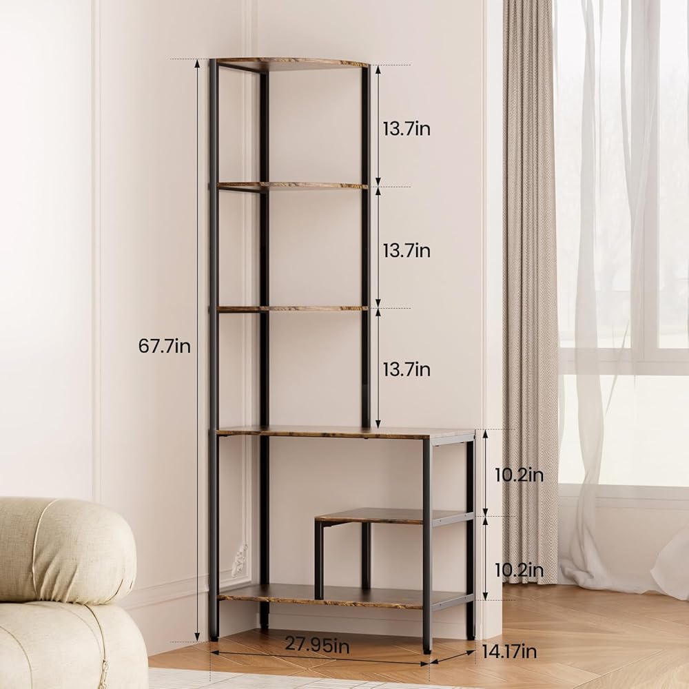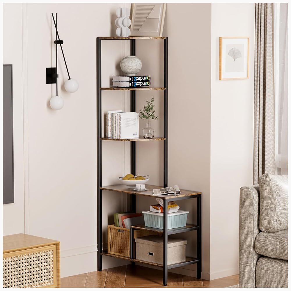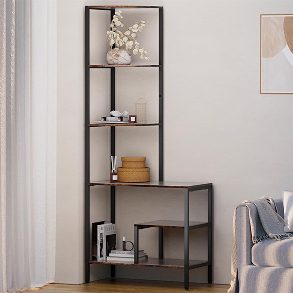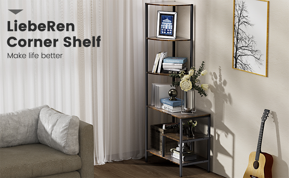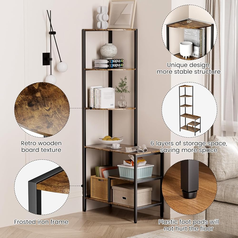 Corner Bookshelf-retro design:Corner bookshelf is designed in an vintage style with a graceful iron and wood construction.This corner shelf with 5 tier will make your living room look more elegant and stylish. The corner shelf stand is not only practical, but also beautiful.