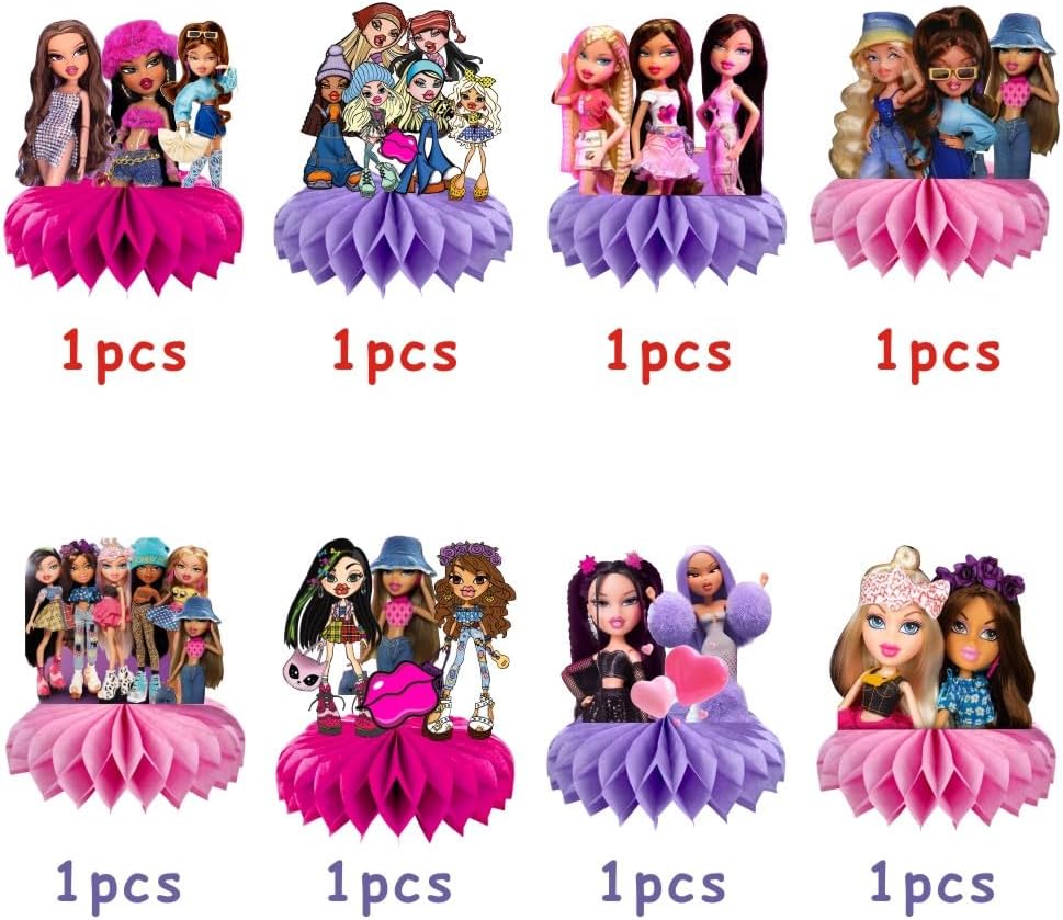 You will receive 8pc Brat Girls themed honeycomb centerpieces. With its stylish design and cute characters, it's sure to be a hit with both kids and adults!