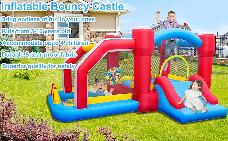 【6 in 1 Fun Projects】This inflatable bouncy castle features a bouncy area, smooth slide, ball pit, basketball rim with a basketball, dart target, ring toss game, which will replace harmful electronic devices and definitely delights your kids.