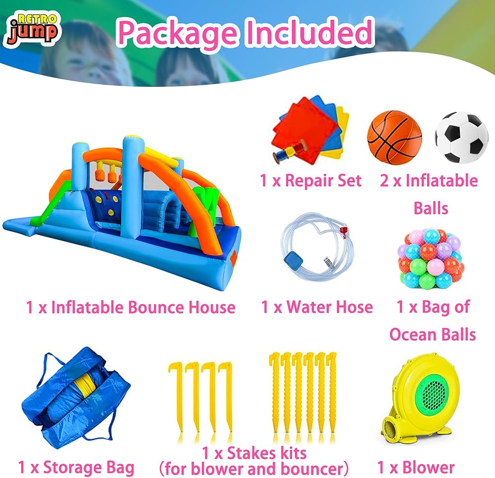 【Customer Guarantee】 Including 550W blower, bouncer & blower stakes, repair patches, basketball,football,ocean balls,carrying bag. We want to make sure you're completely satisfied with our products. All of inflatable bounce house come with a 90-day limited warranty.