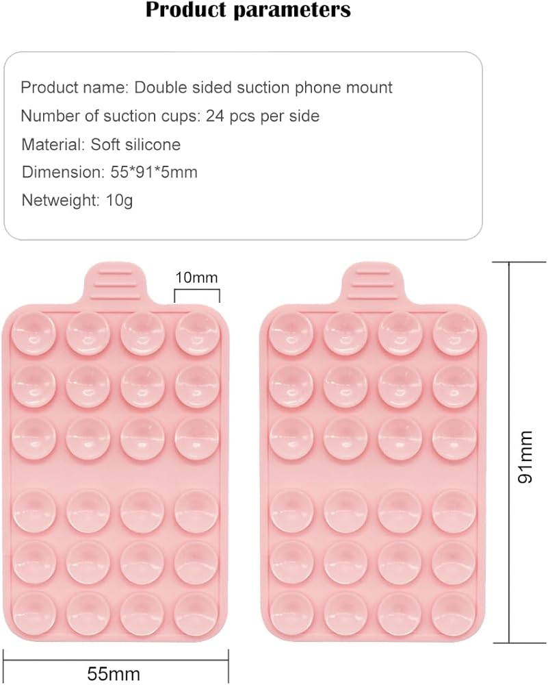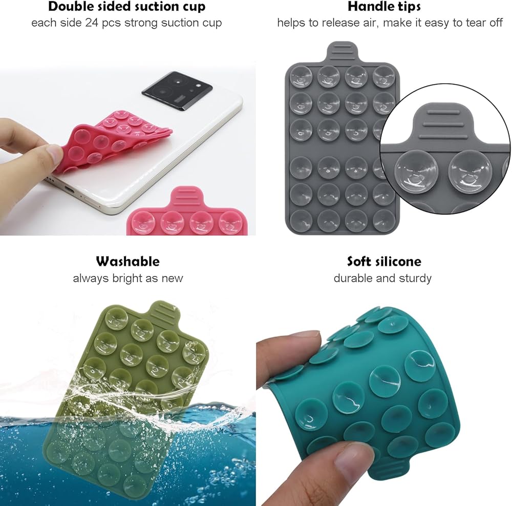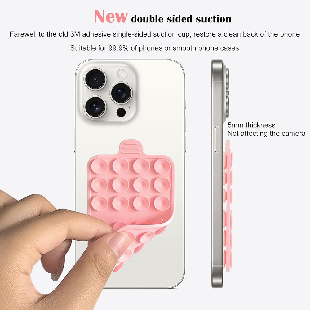 [Strong suction] 24 soft silicone suction cups on each side, with high-precision and precise cutting suction cups that do not leak air and have strong suction power, which grab your phone, tablet, and other devices tightly. The thickness of the silicone suction cup phone holder is 5mm, and most phone cameras will not be affected.