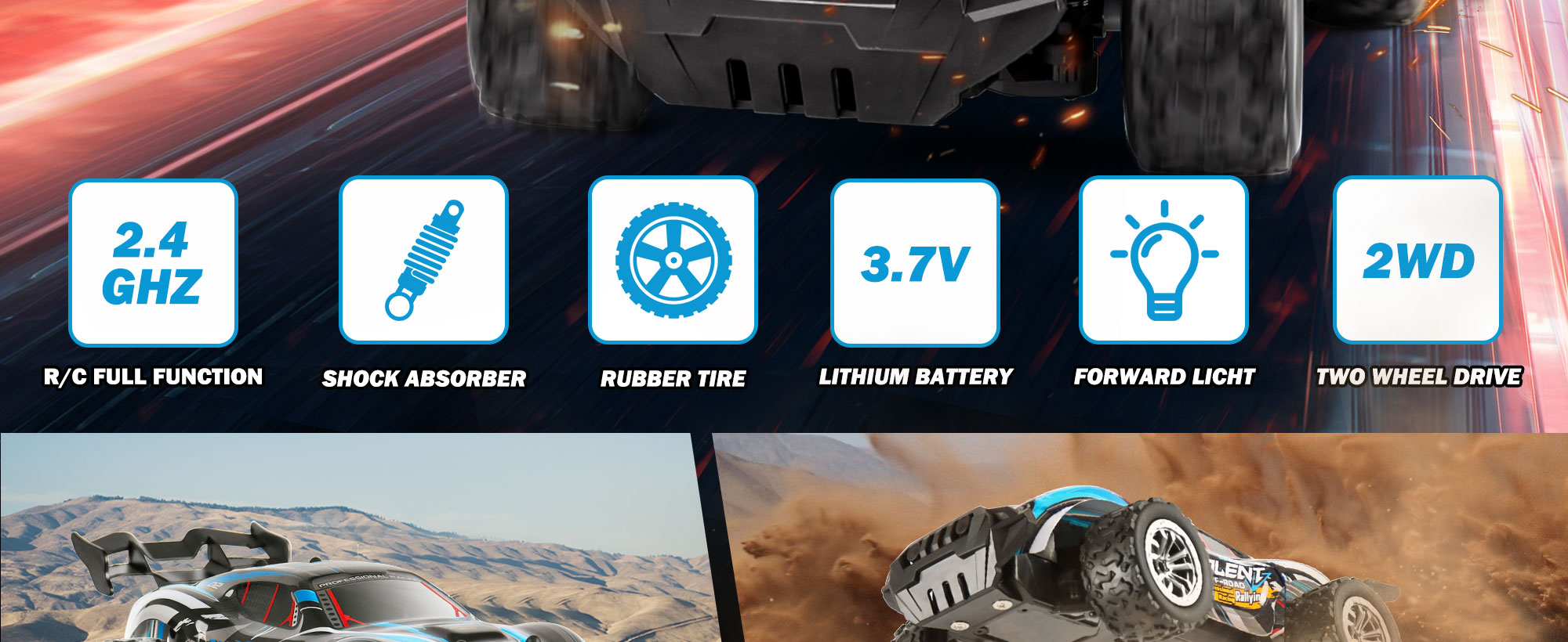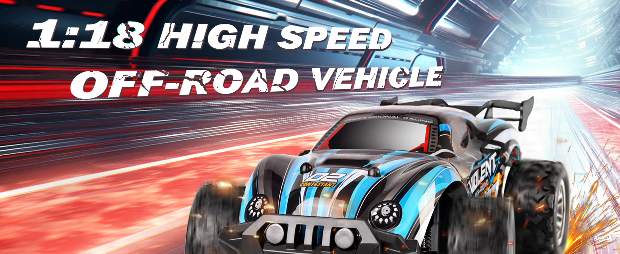 [1:18 High Speed RC Car] This fast race car is equipped with super strong motor, let you enjoy the thrill of high speed racing at 20+ KM/H. With a blue body, unique rear wing and cool colorful lights, the car can drive smoothly even at night. It is the best choice for monster RC truck lovers