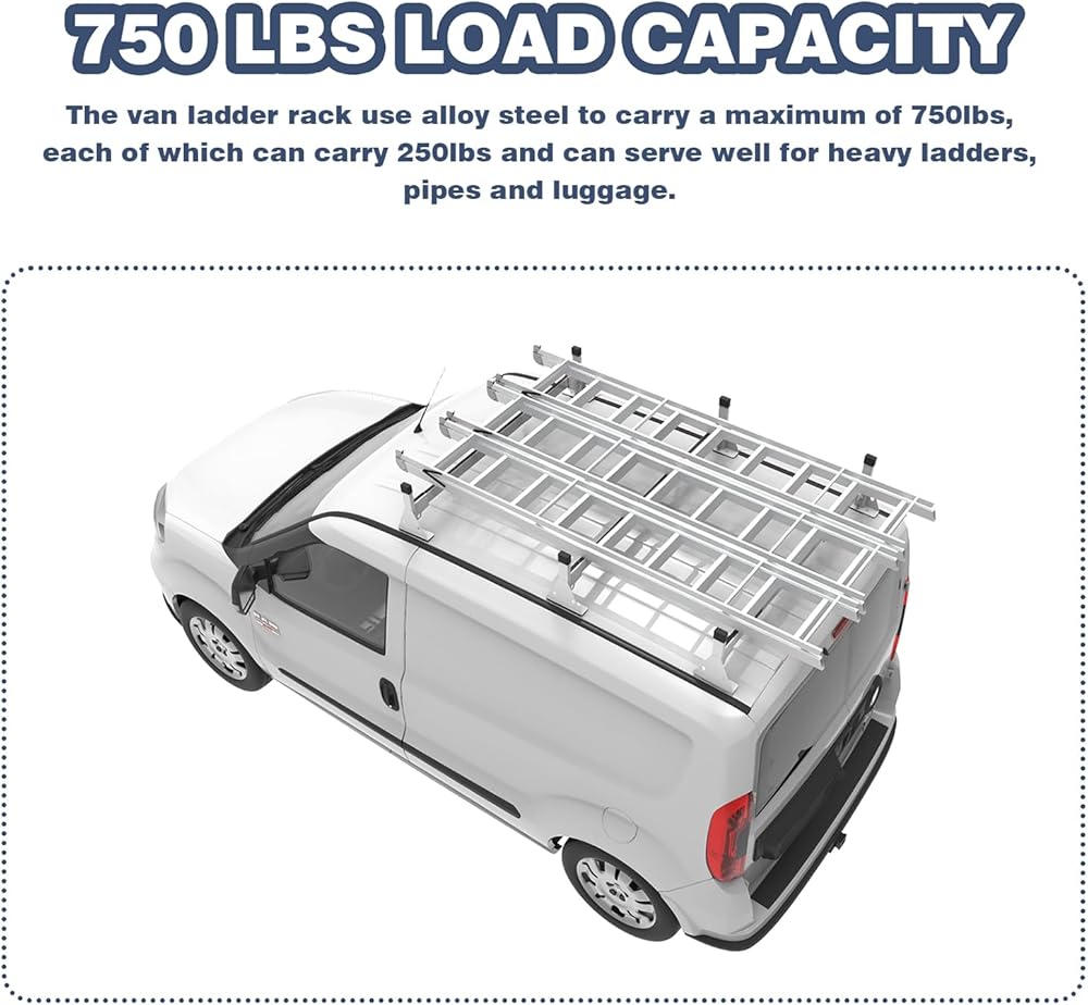 CAPACITY: The van roof rack systems have been specially designed to carry a maximum of 750lbs, each of which can carry 250lbs and can serve well for heavy ladders, pipes and luggage.