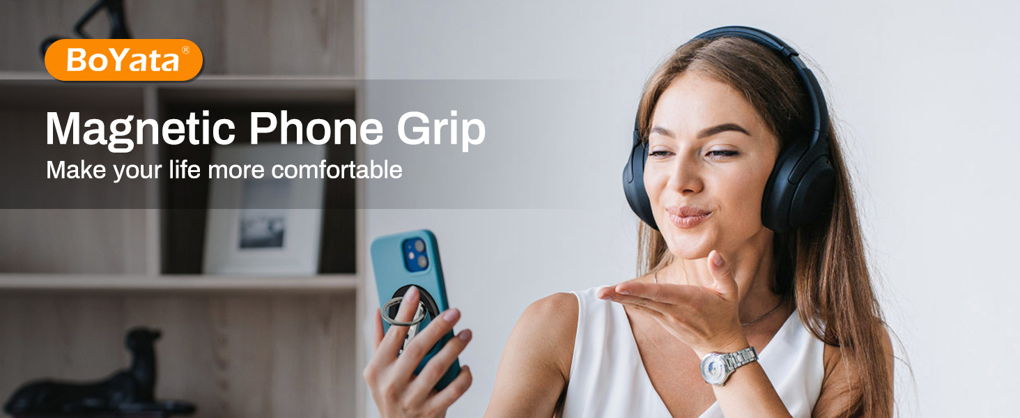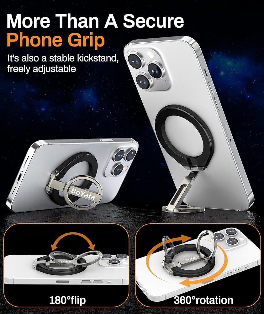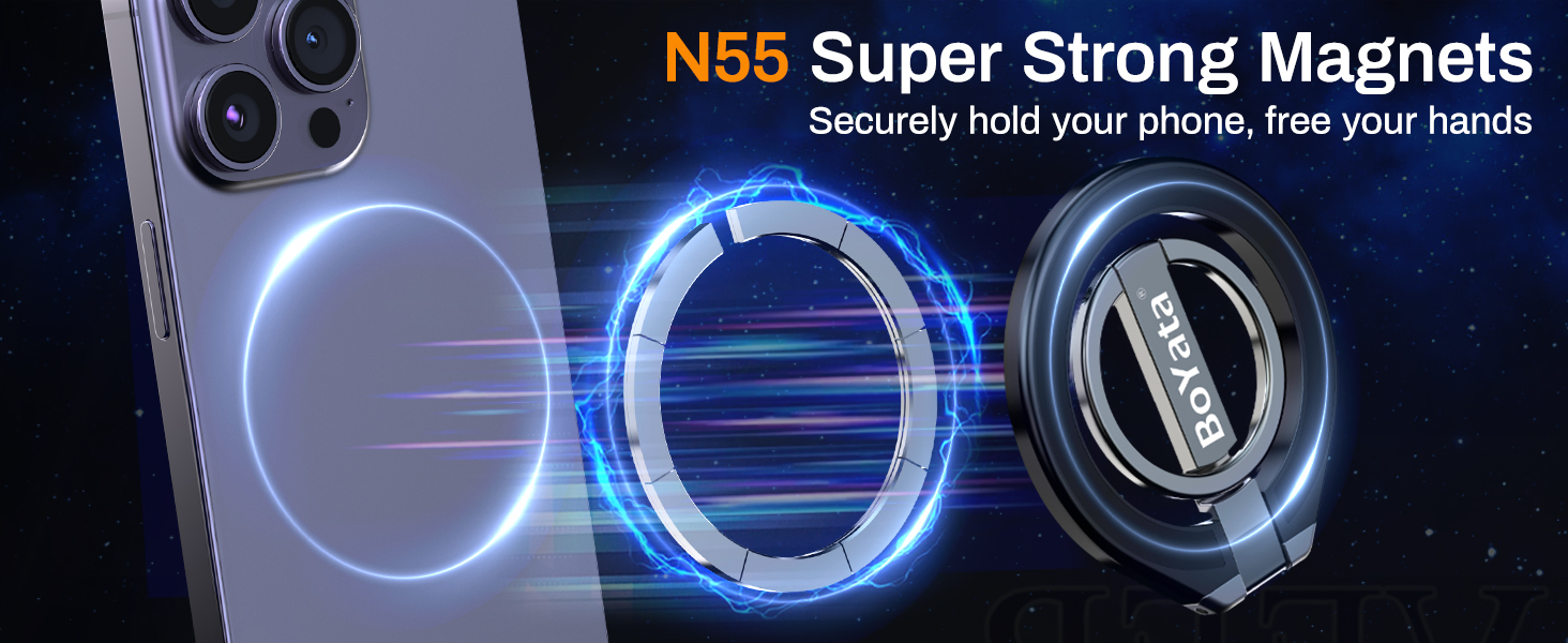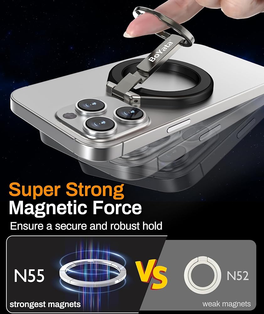 ULTRA-POWERFUL MAGNETISM: The BoYata magnetic phone ring holder grip has built-in N55 stronger magnets, making it more powerful than other N52 or N48 magnets, ensuring a secure hold, eliminating any risk of slipping or falling. The upgraded pivot enhances the adjustable phone grip's durability, providing a more reliable and enduring use.