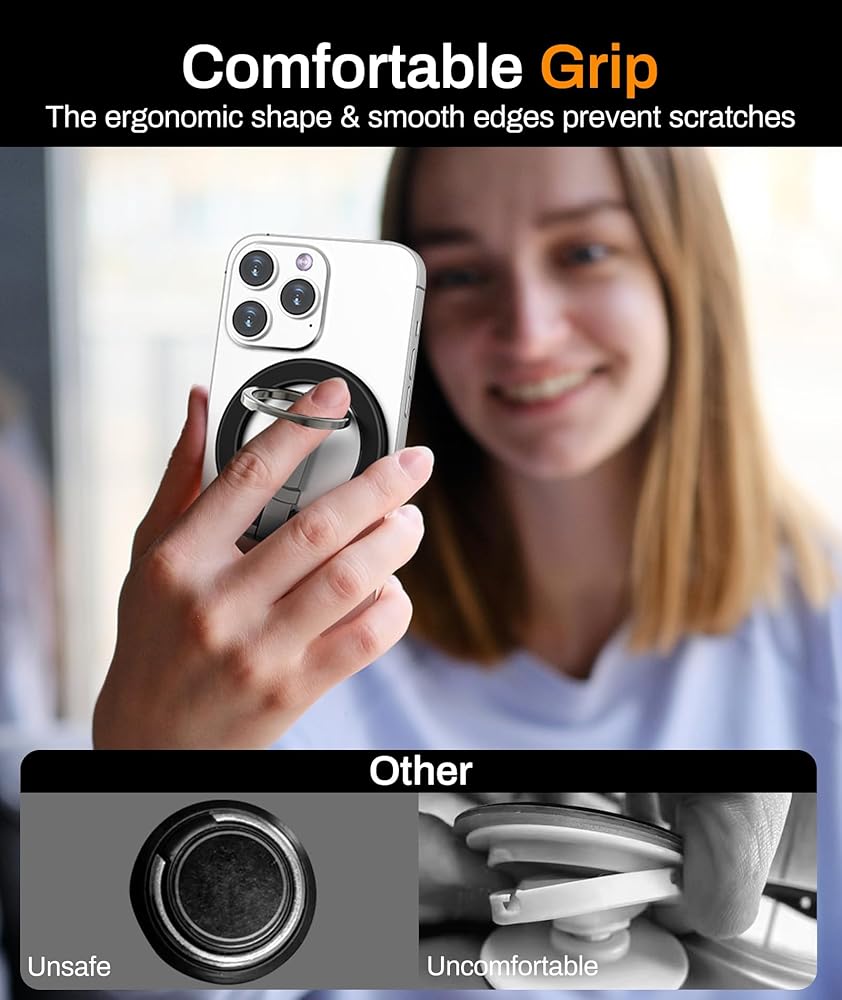 BROAD COMPATIBILITY: The mobile phone grip fits for all phones. Directly compatible with iPhone 15/14/13/12 series, Mag-safe case. Also compatible for other iPhones, Samsung, Android devices, even with regular phone cases. Please use the included metal ring to the back of your phone or case for these non-magnetic devices. The packaging includes 1* magnetic cell phone grip, 1*metal plate, 1*metal ring, 1* manual.