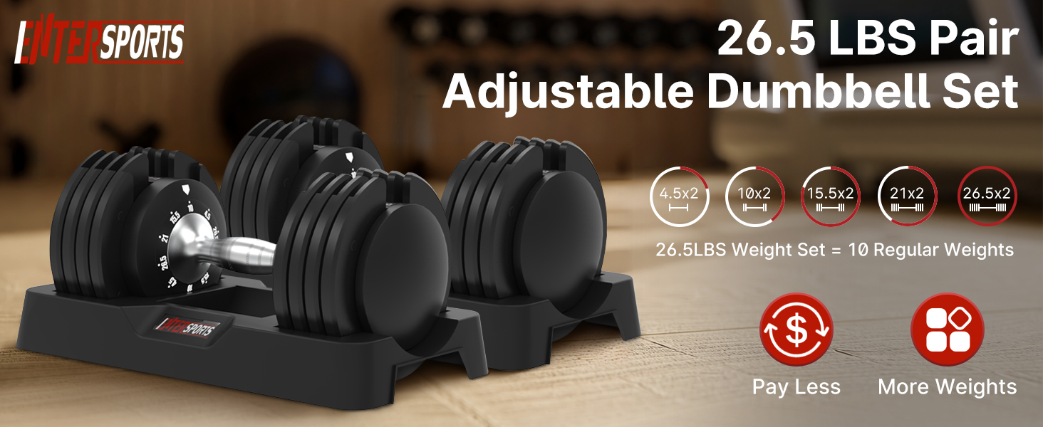 [4.5-26.5 Lbs Adjustable Weights]:EnterSports adjustable dumbbell set has 5 different adjustable weights( 4.5lbs, 10lbs, 15.5lbs, 21lbs, 26.5lbs). You only need the space of 1 set of dumbbell to get the workout experience of 5 different weights. You can start your daily workout at home!