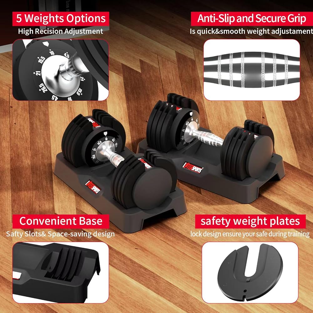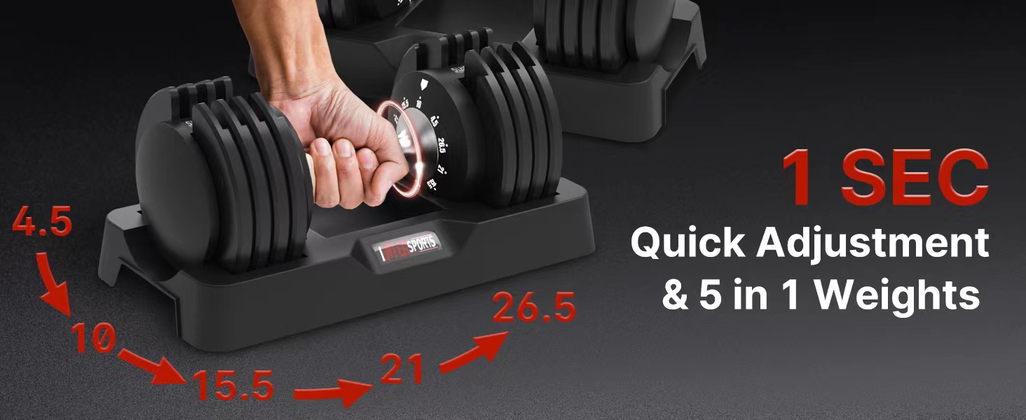 [1 second quick adjustment]: With a unique dumbbell design, simply turn the handle with one hand to adjust the weight of dumbbells from 4.4lbs to 26.5lbs in 1 second! Enjoy more convenient adjustment experience and get better training efficiency. ATTENTION: Please make sure you hear the "click" sound before lifting the handle to prevent the plate from falling down.