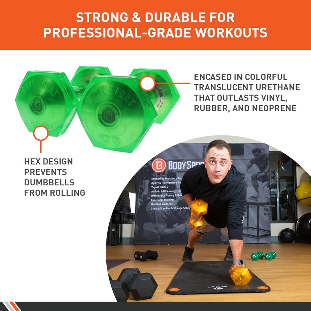 Strong and Durable. BodySport Urethane Jellz Coated Dumbbells are highly durable and resistant to impact from high-intensity workouts. The non-abrasive coating resists scratching, keeping the dumbbells looking newer for longer.