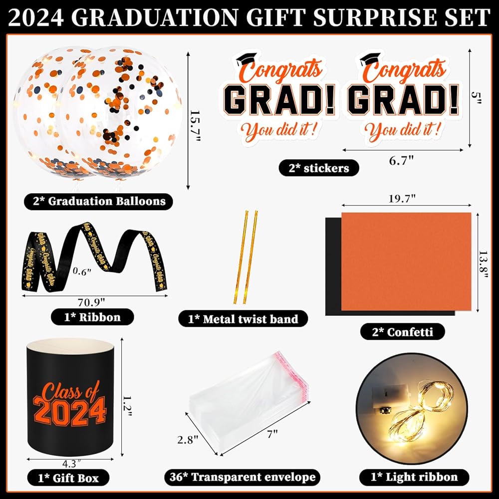 2024 Graduation Money Pull Box Balloon Gift Set includes: 1* Gift Box 1* Ribbon 1* Metal twist band 1* Light ribbon 2* Graduation Balloons 2* Confetti 2* stickers 36* Transparent envelope.Perfect graduation gift, a great surprise for your graduates!