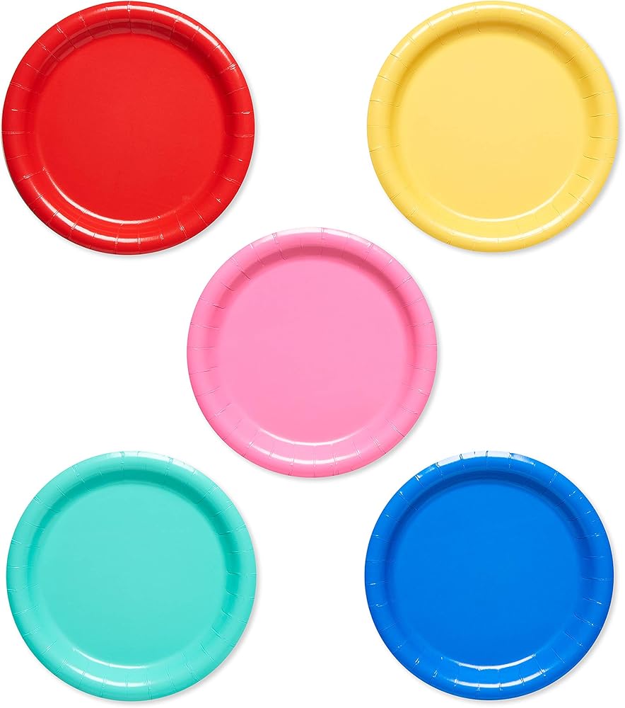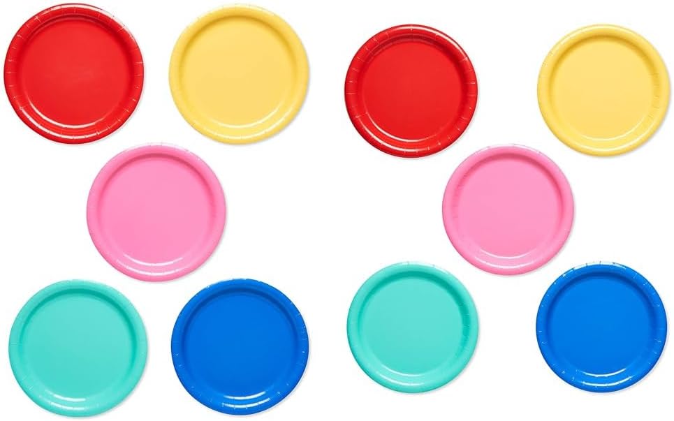 Throw a super colorful celebration or birthday party with solid-colored dessert plates! This colorific set of paper dessert plates/small lunch plates features a rainbow of solid colors in blue, teal, yellow, pink and red. A fun and stylish choice for all ages, plates feature a sturdy construction and beveled rim, making them perfect for serving cupcakes, ice cream and party snacks. A great value for large parties, the package includes a total of 50 plates. Great for a birthday party, graduation, congrats, holidays and general entertaining, this versatile mix of multicolored plates will have you covered. Go bold with one color or mix and match the hues for party décor that will make them want to celebrate!