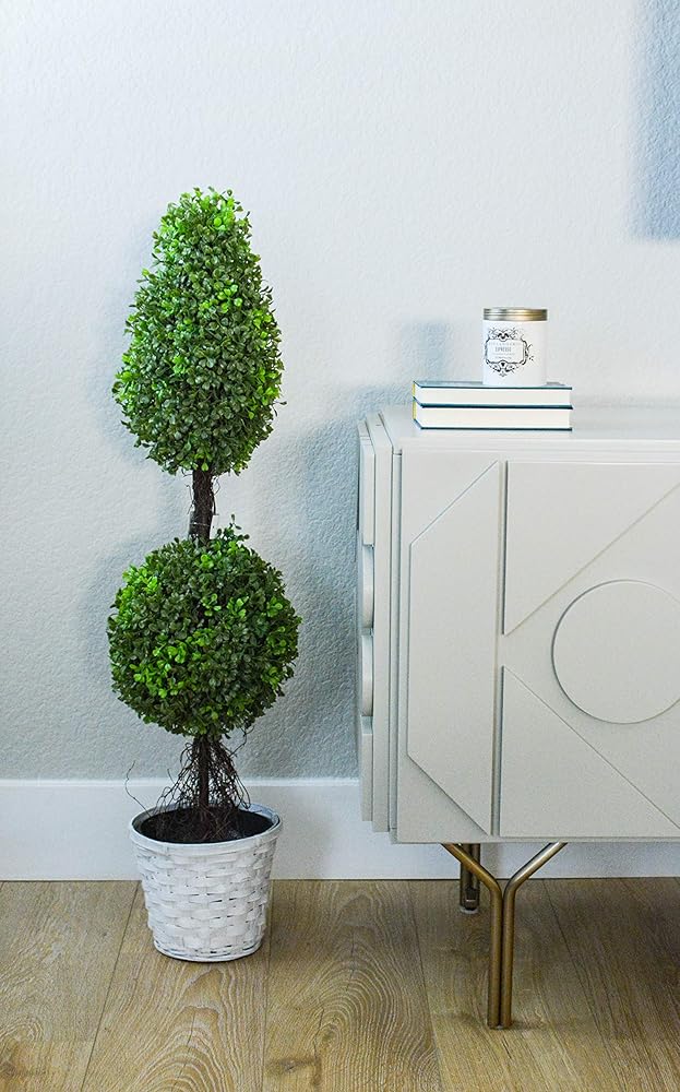 [Design] Each artificial topiary potted plant is made with high-quality faux boxwood for a natural lifelike look that lasts all year round. This tree comes realistic spiral shape topiary in evergreen color and wrapped in an aesthetic green planter base.