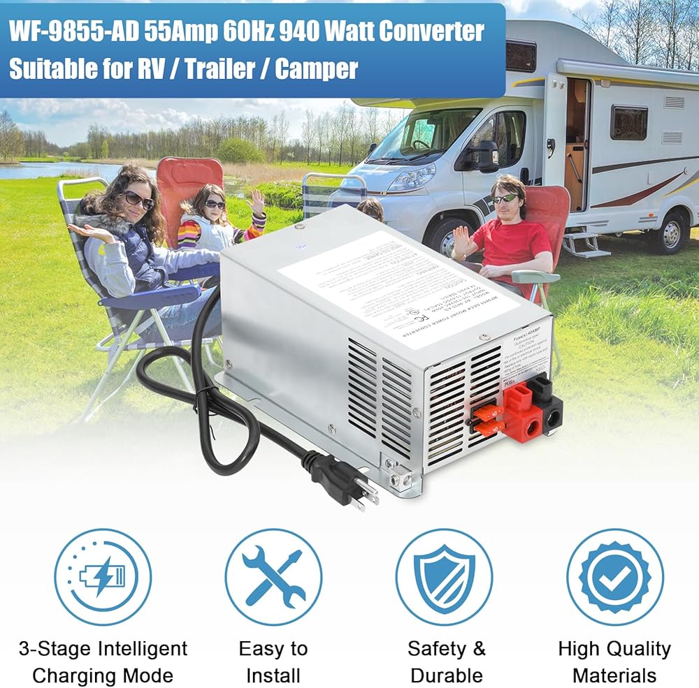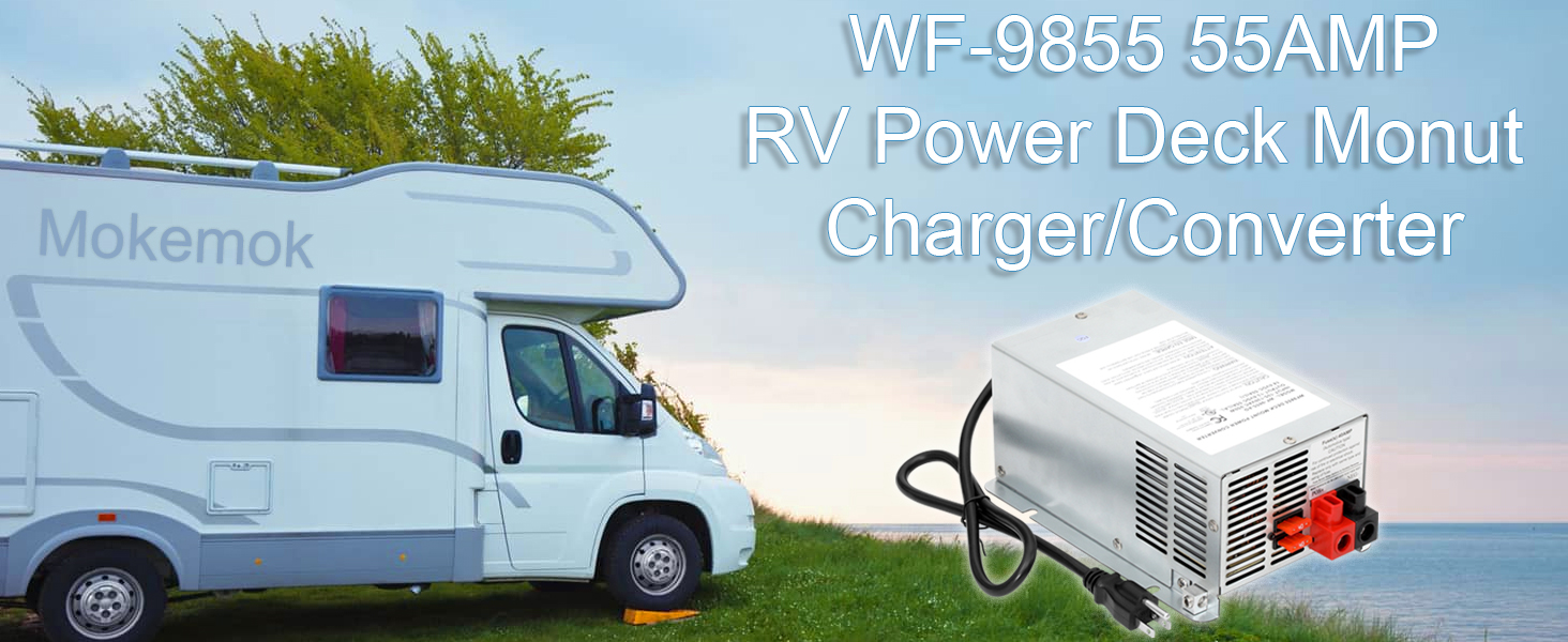 【Great Compatibility】This WF-9855 55Amp Deck Mount RV Power Converter/Chargers is versatile, advanced power source solutions. Perfect Replacement for RV Trailer Camper 9800 Series (55 Amp). WF-9855 model provides 55 Amps of clean, reliable DC power, even without filtering from a battery, which is ideal for powering electronics and appliances.