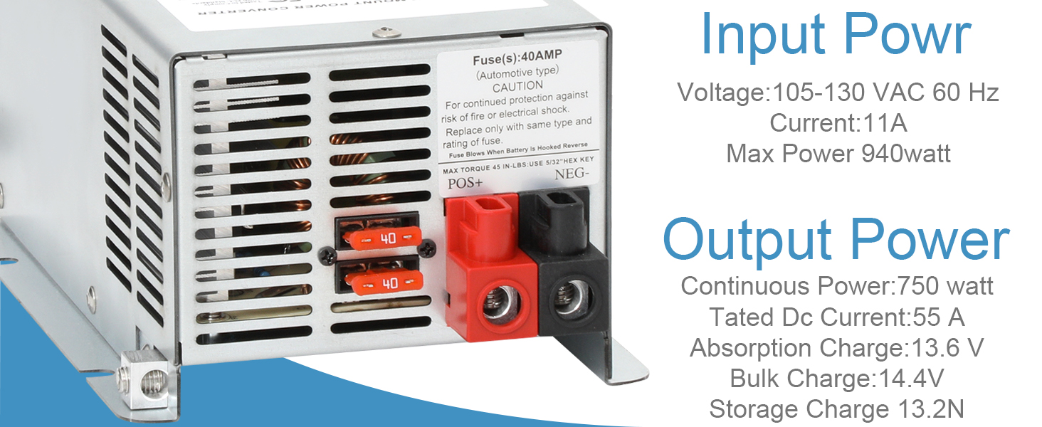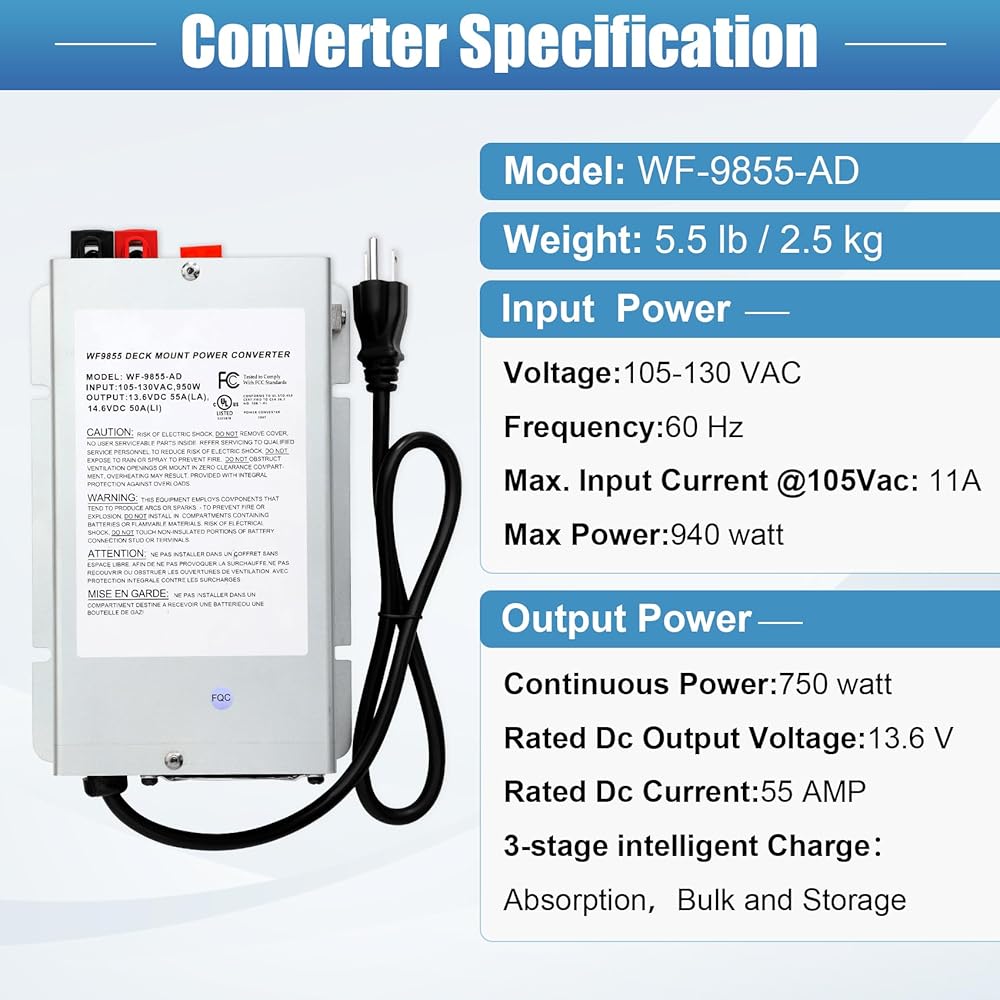 【WF-9855-AD Converter/Charger Specifications】AC Input: Voltage: 120 Vac, 60Hz. Current:11 A | DC Output: 55 Amps | Automatic three-stage battery charging maintains your battery's life with 3 nominal voltage output modes: 13.2 VDC range “float” mode, 13.6 VDC range “absorption” mode, and a 14.4 VDC range “bulk” charge mode | Suitable for both lithium batteries and lead-acid batteries.
