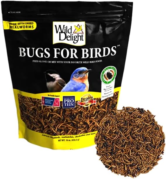 Feed this premium three-bug blend and attract more birds. Protein-rich bird food blend that provides the nutritional benefits of insects all year round. Dried black soldier fly larvae are a protein-rich treat for your birds and contain naturally occurring organic proteins. Features well-balanced nutrition with dried black soldier fly larvae, dried mealworms, dried darkling beetles. Serve in tube feeders, hopper or platform feeders. Bugs for birds blend, you receive the 16 oz. bag.