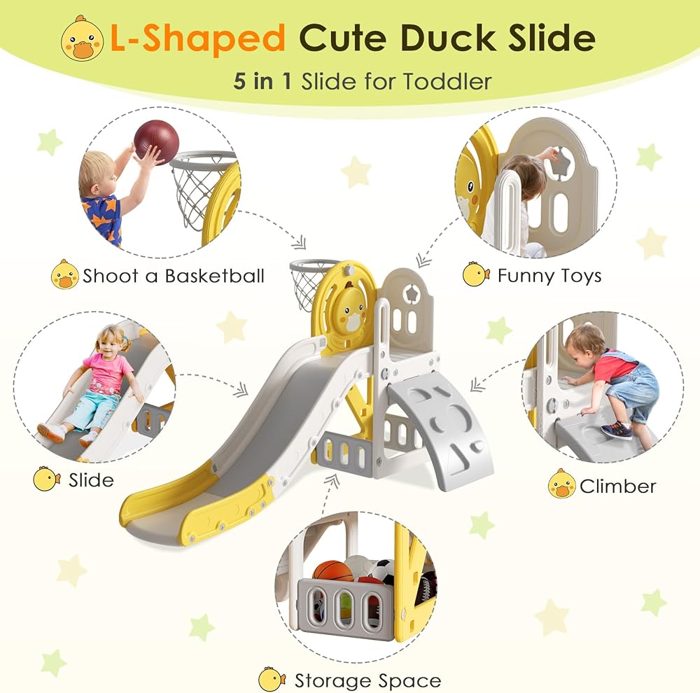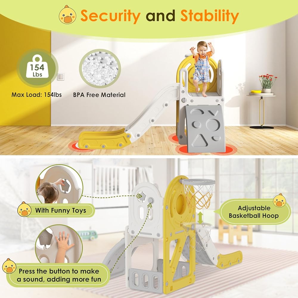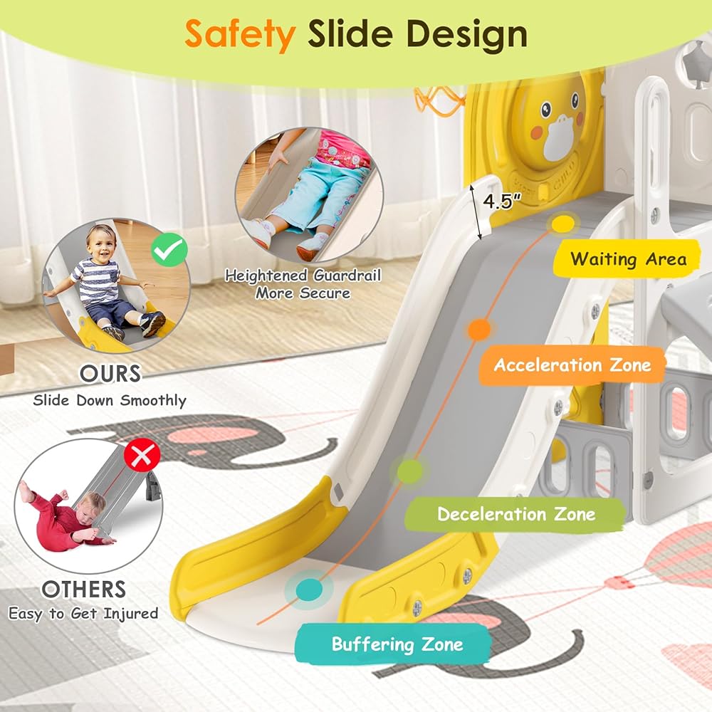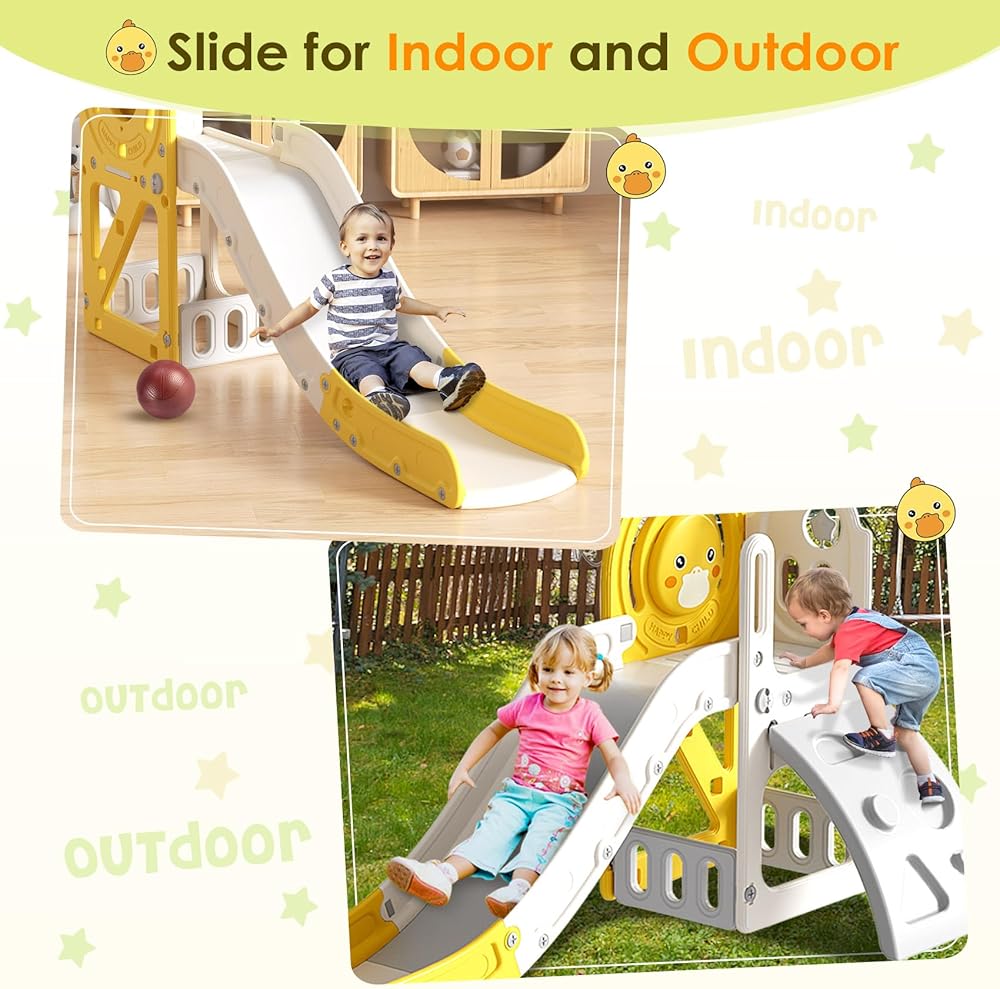 🐥 CUTE DUCK DESIGN SLIDE - The cute duck pattern board can be installed on the inside or outside, and toddlers will enjoy playing on the slide even more. There is a rotatable five-pointed star design and a sound button on the side, press and tap for more fun.