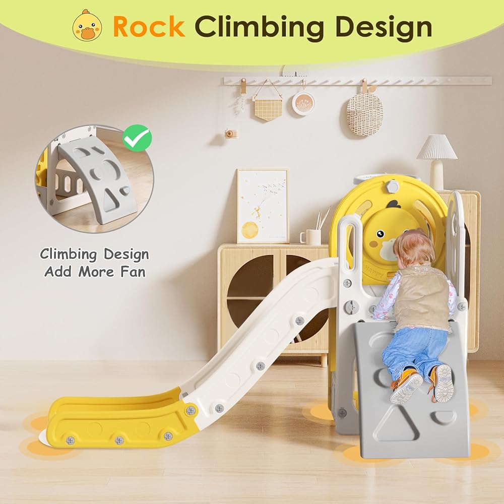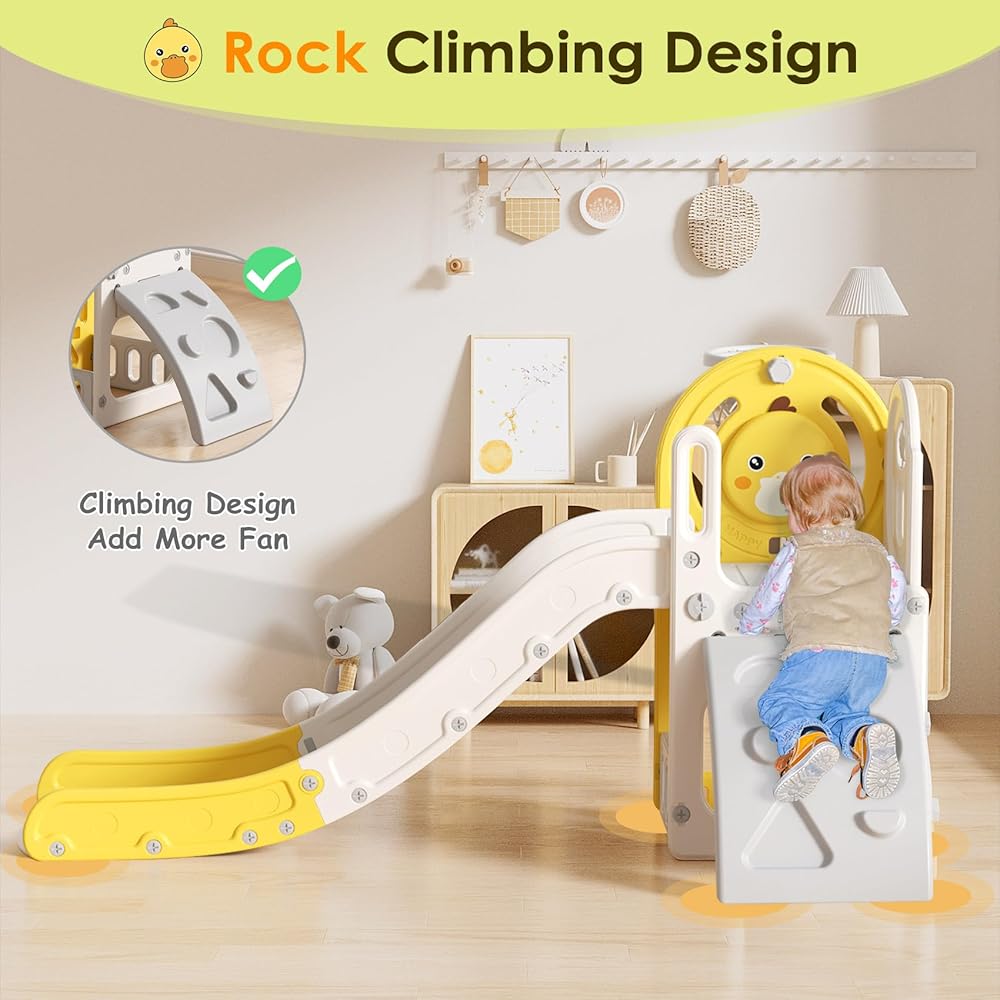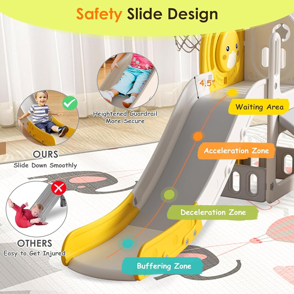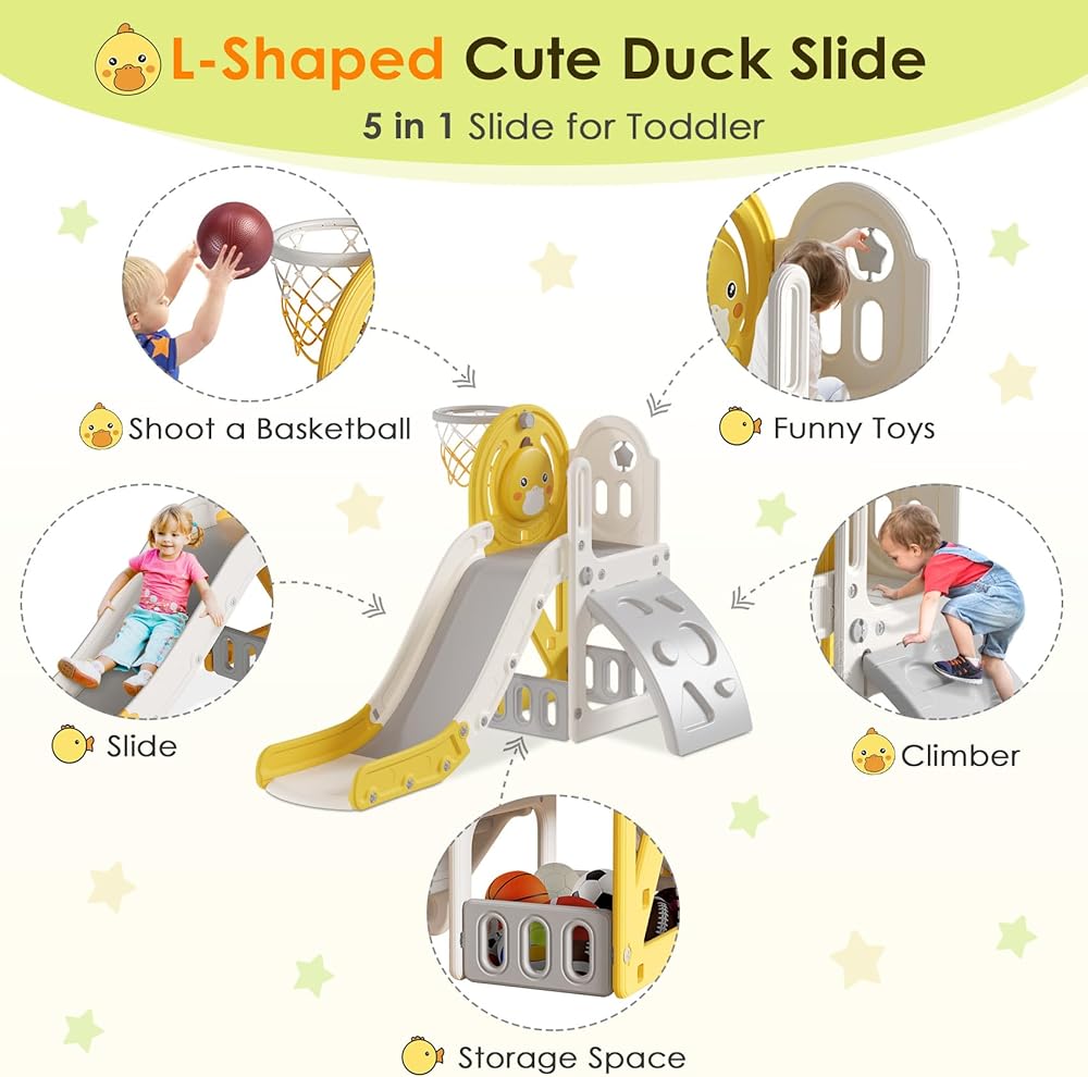 🐥 CUTE DUCK DESIGN SLIDE - The cute duck pattern board can be installed on the inside or outside, and toddlers will enjoy playing on the slide even more. There is a rotatable five-pointed star design and a sound button on the side, press and tap for more fun.
