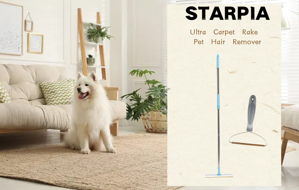 Pet Hair Remover Set: This is a 55 inch carpet dog hair broom and a short grey pet hair remover. The handle bar is made of high quality ABS material and the broom head is all brass for sturdiness and durability. The solution to the problem of many pets in the house and hair flying everywhere.