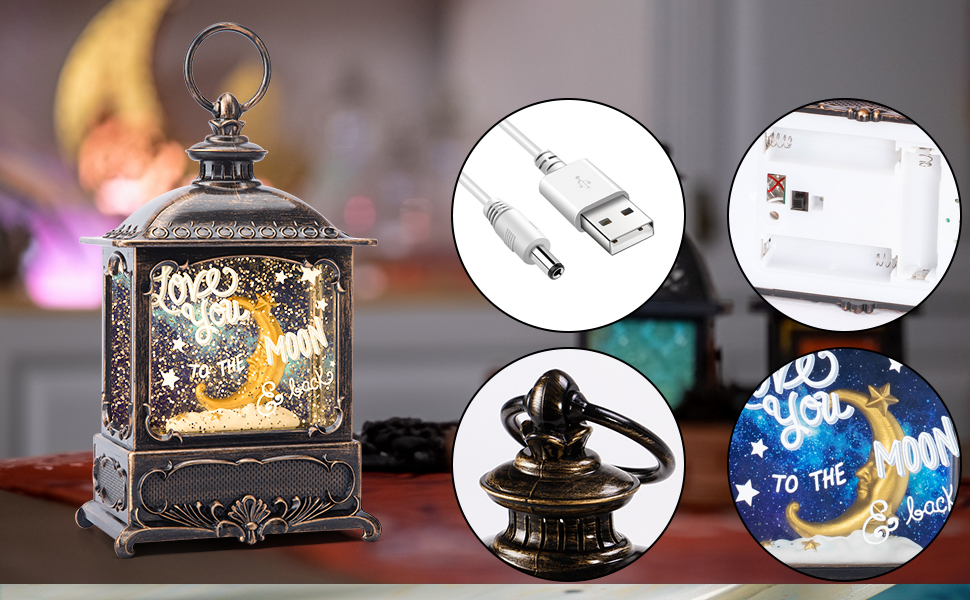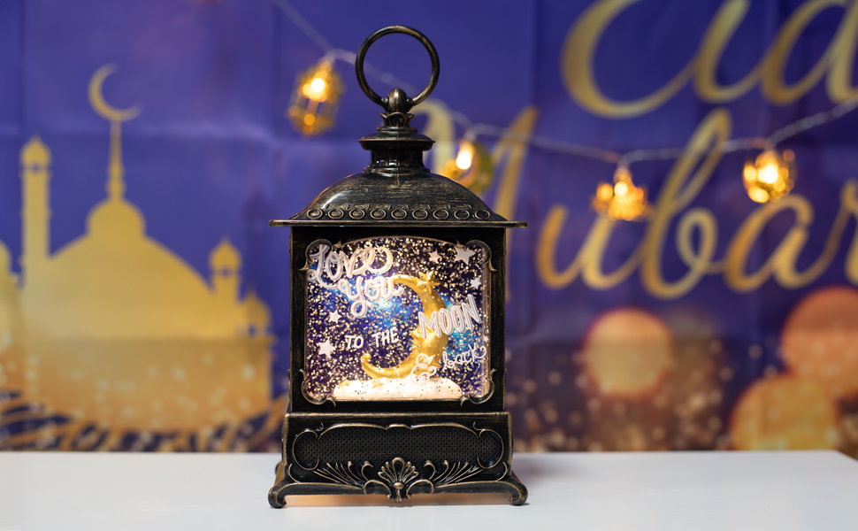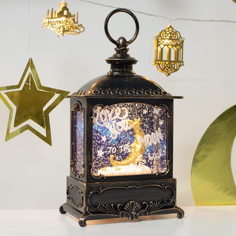 Sparkly Snow Globe: Bring in the spirit of Ramadan and Eid Mubarak with our beautifully crafted Snow Globes, Lantern Lights, and Moon Star decorations.with dual power options of being battery operated for cordless convenience and USB operated for power saving.watch in awe as the glittering snow swirls around the lantern, creating a mesmerizing display of lights.