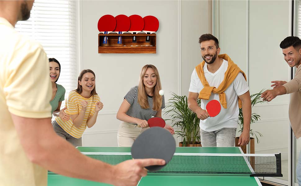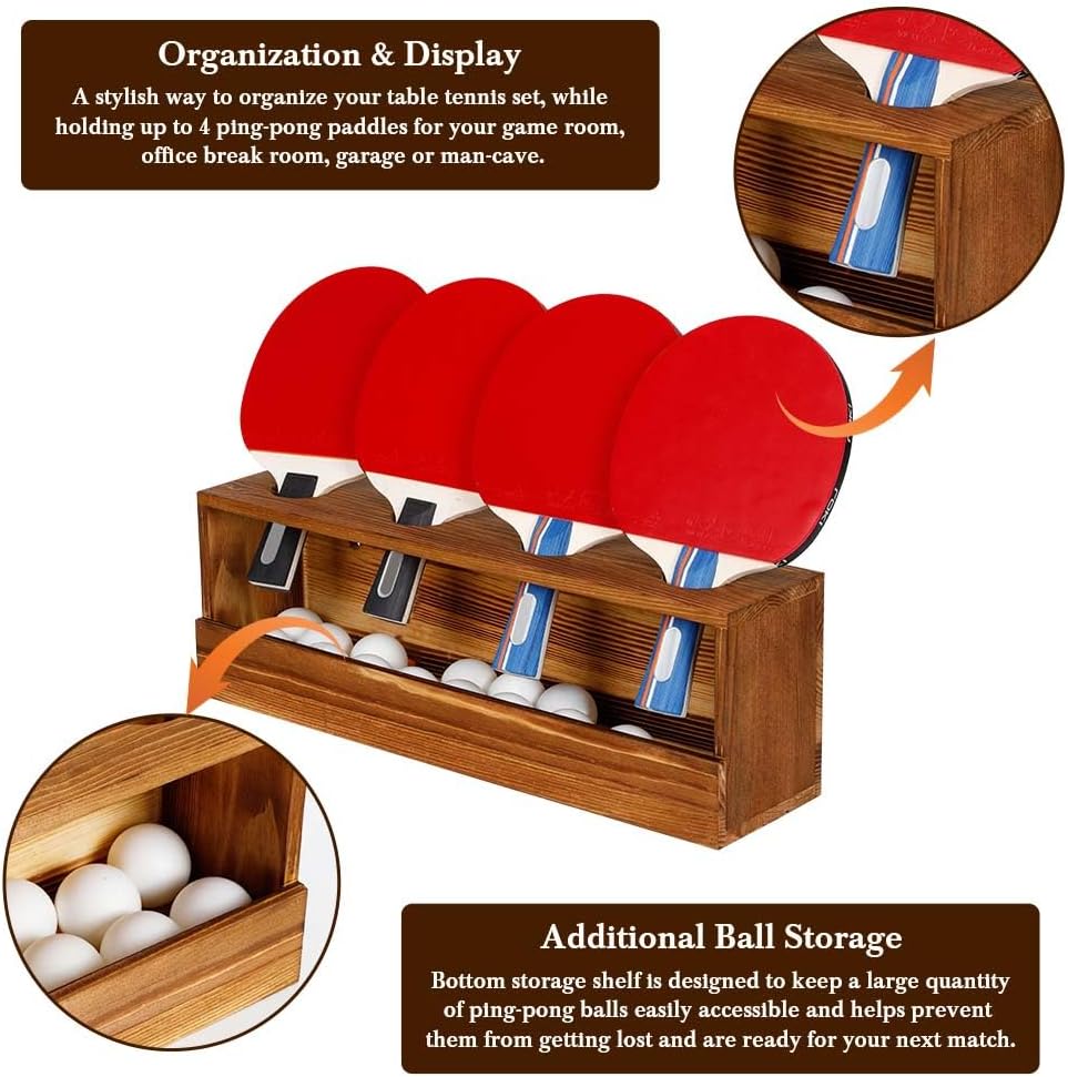 The display rack has 6 racket slots and a bottom shelf for storing ping pong balls and other game accessories. Note: Excluding rackets and table tennis balls