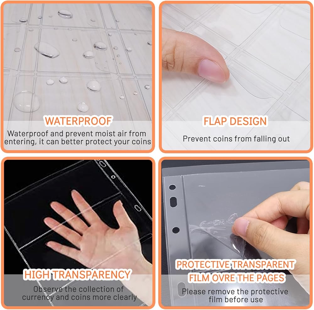 【High-Quality Thick Transparent Inner Pages】The thickness of the inner pages of the coin collection booklet is 28c, which is thicker than the inner pages of other collection booklets on the market; both sides of the inner page are highly transparent, which can clearly display both sides of coins and banknotes for easy viewing; the inside page of the coin has a flip cover to prevent the coin from slipping off and provide better protection for your rare coins