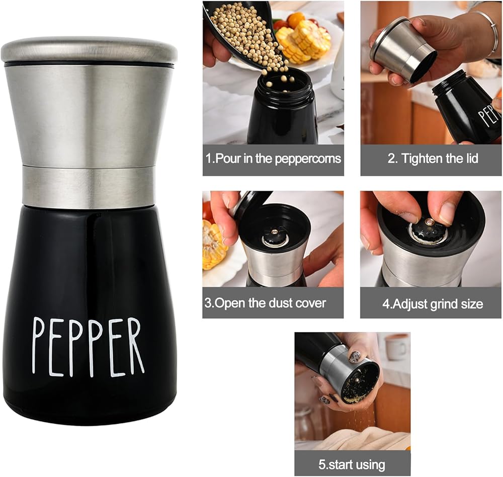 Easy to fill: The bottle mouth is relatively large, allowing you to easily fill in black pepper and salt. The grinding bottle is equipped with a stainless steel dustproof cover to keep the pepper and salt clean and hygienic.