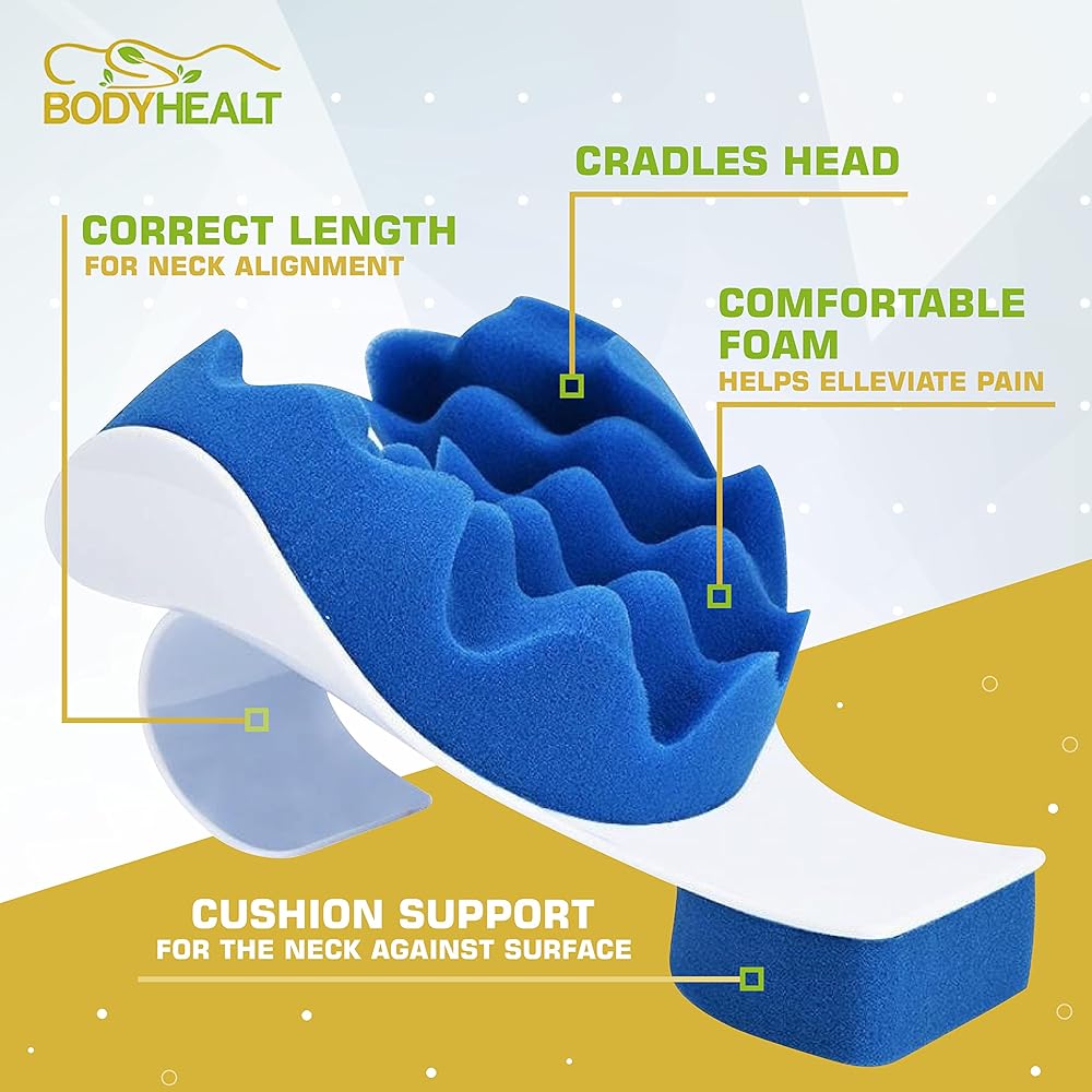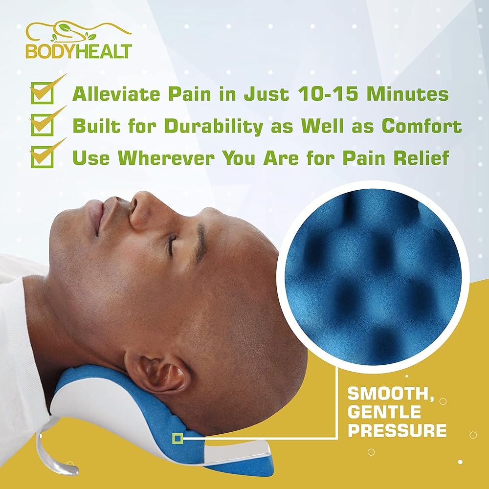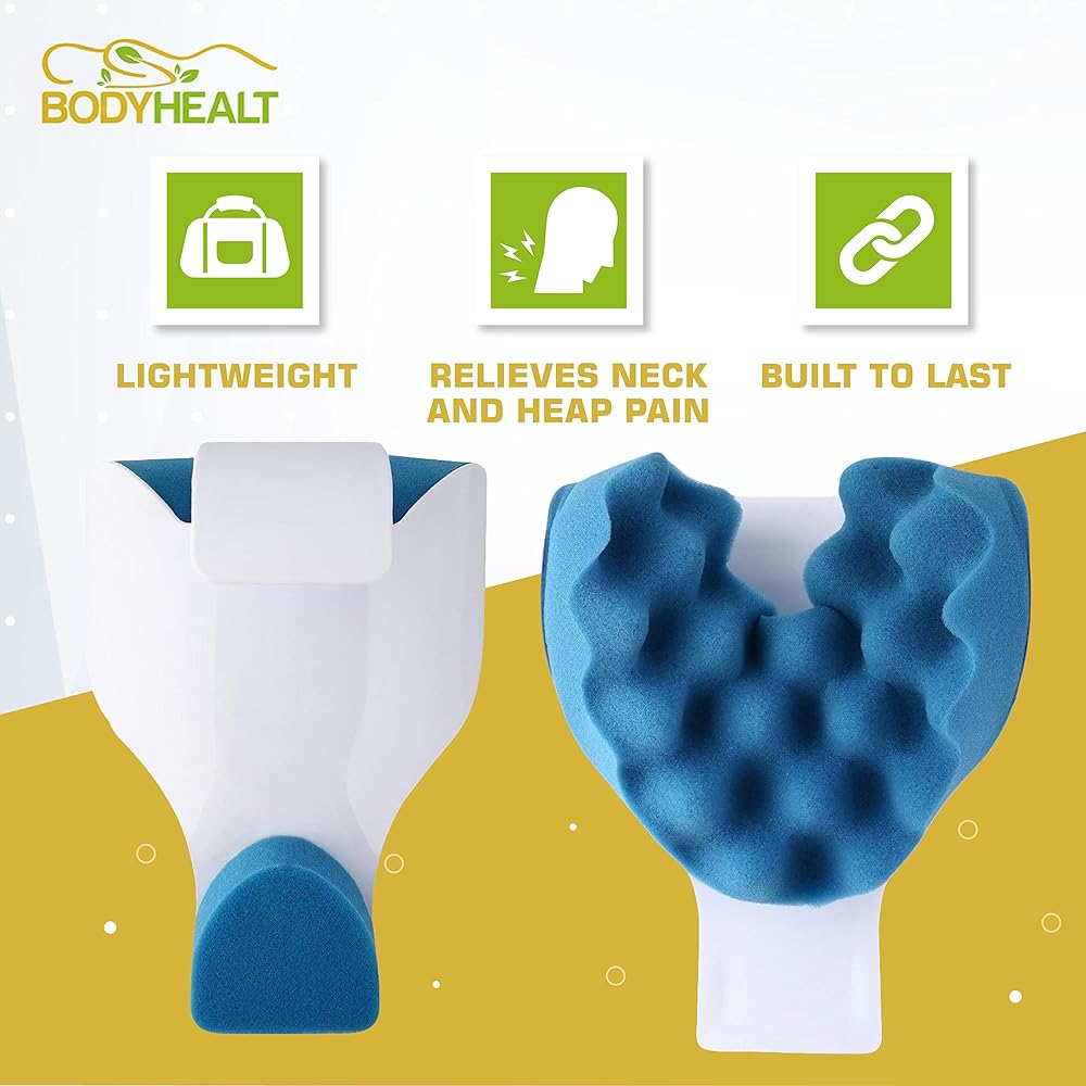 Durable Construction. The BodyHealt neck stretcher for neck pain is expertly made using sturdy plastic construction to cradle the weight of your head and shoulders without breaking or snapping. Meanwhile,the soft, pillowy foam of the soft neck brace for posture, tmj pillow gently wraps around your neck, head and shoulders for optimal comfort for TMJ neck.