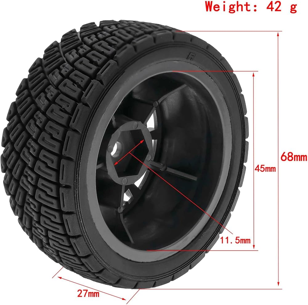 👍👍 RC Wheel and Tire Size: Tire OD: 67mm (2.64in); Width: 28mm (1.10in); Wheel Diameter: 46mm (1.8in); Drive Hex: 12mm (0.47in), Please check if our RC tire and wheel is the right size you are looking for Please, avoid return merchandise and save your time due to inconsistent sizes.